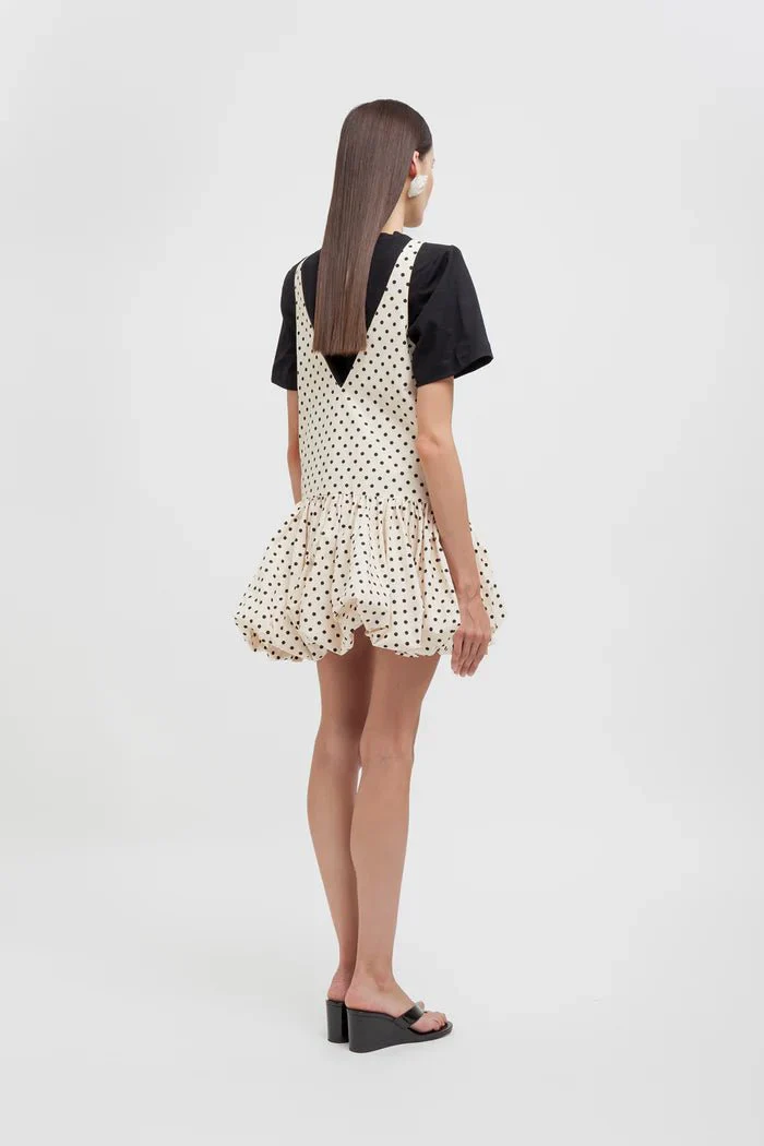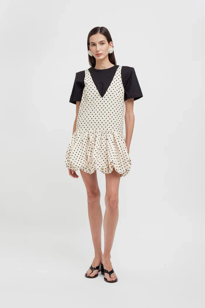 Abito corto a palloncino in mussola di cotone con stampa a pois e ampio scollo a V.