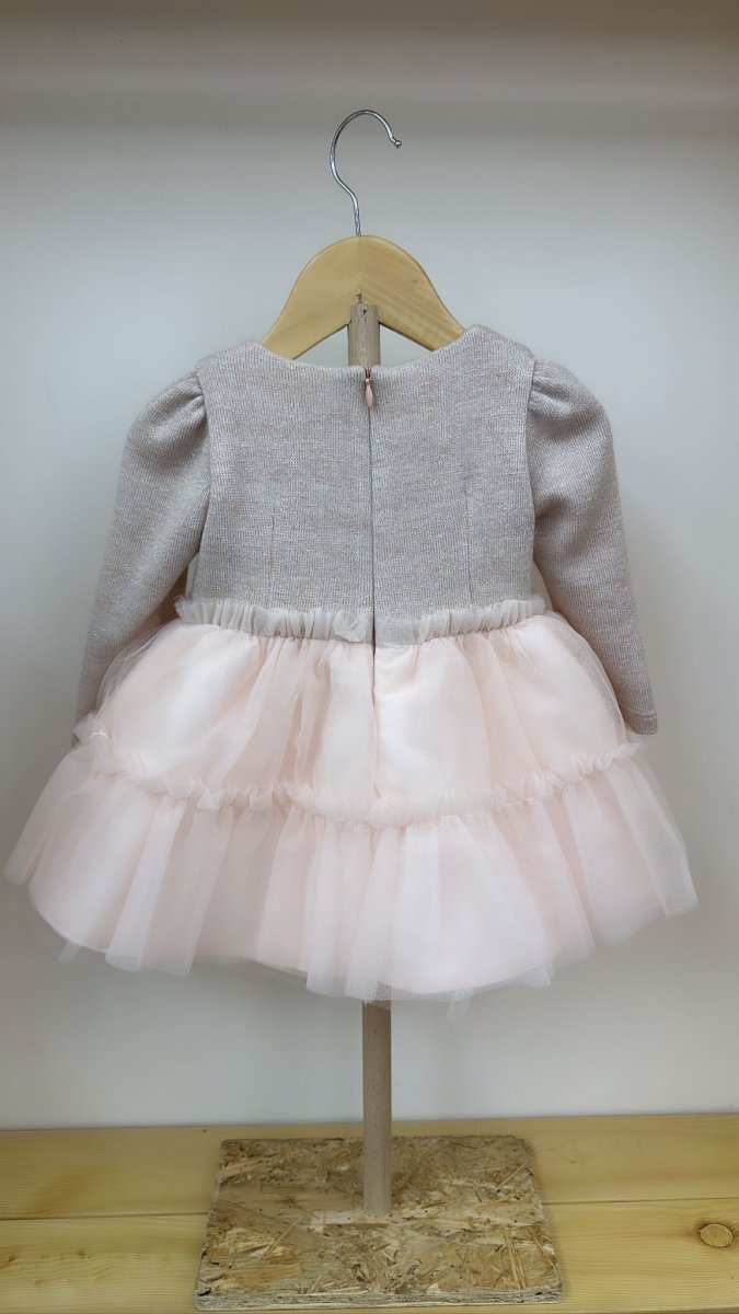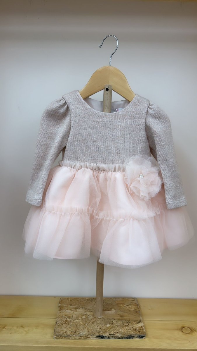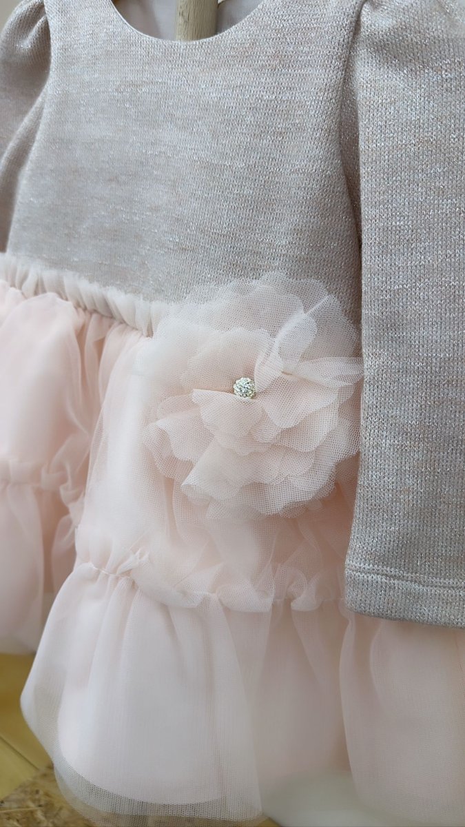 Abito rosa antico a manica lunga, parte superiore rosa glitterato, gonna in tulle rosa con spilla rimovibile a forma di fiore con strass