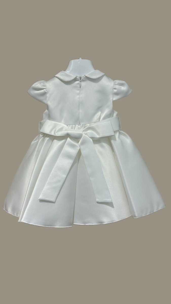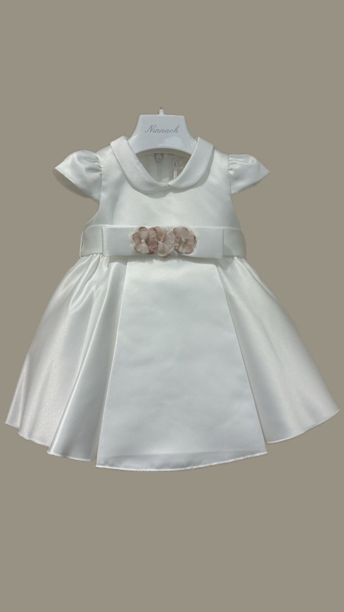 Abito da cerimonia a mezza manica, con fascia a fiocco e fiorellini rosa, color panna