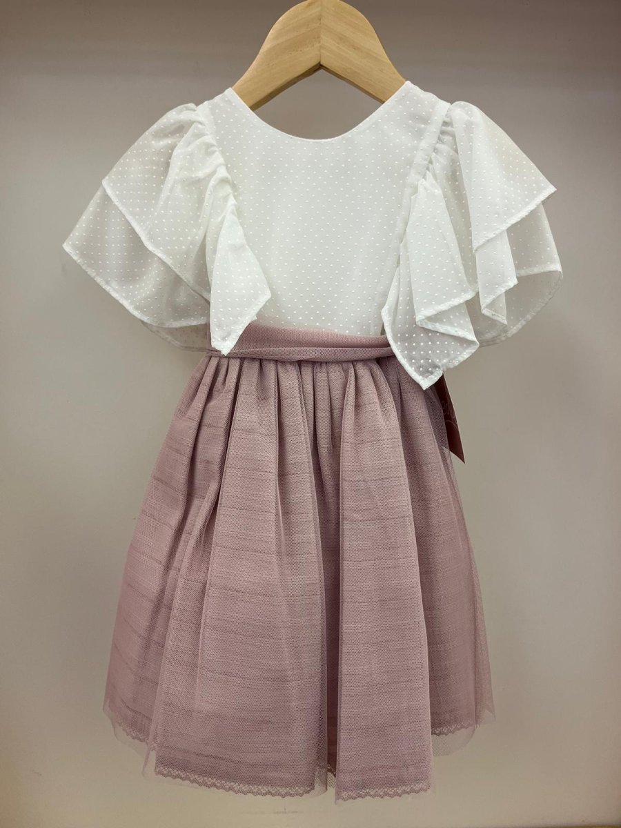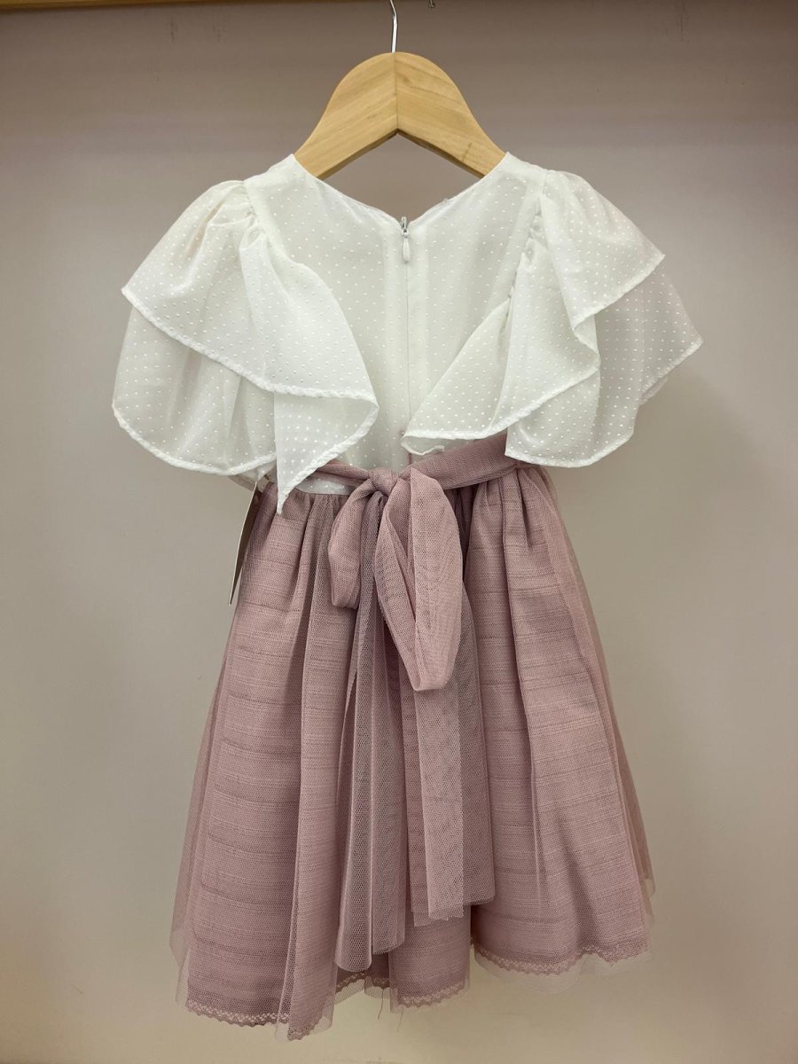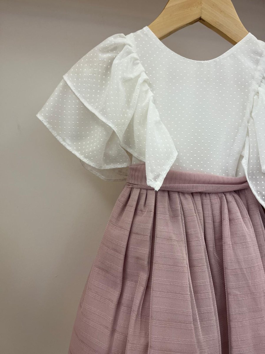 Abito bianco con pois e rouches, tulle rosa, Yoedu