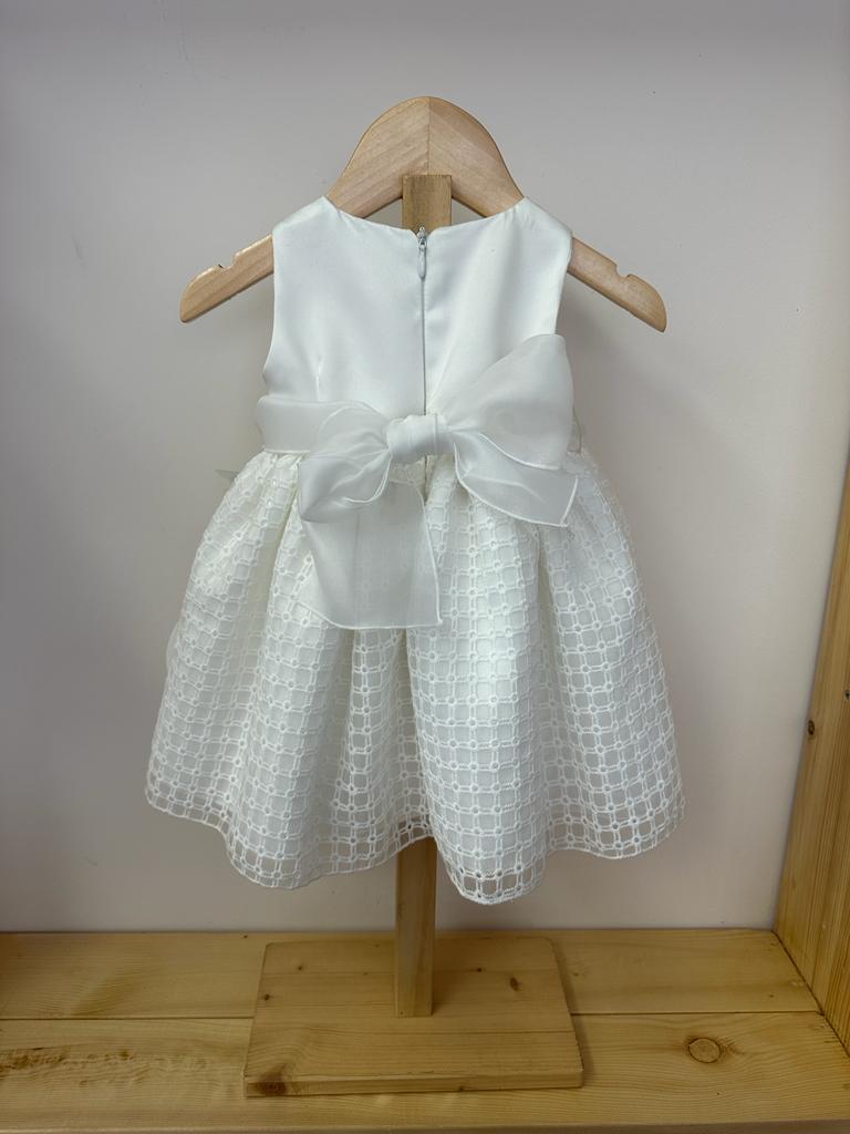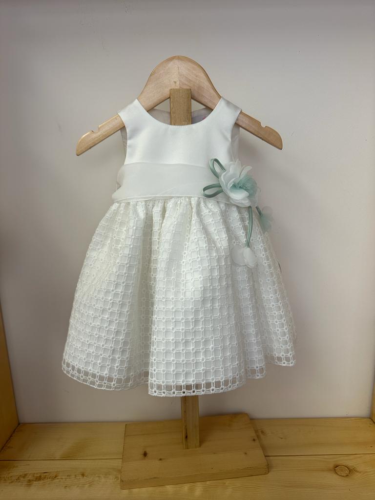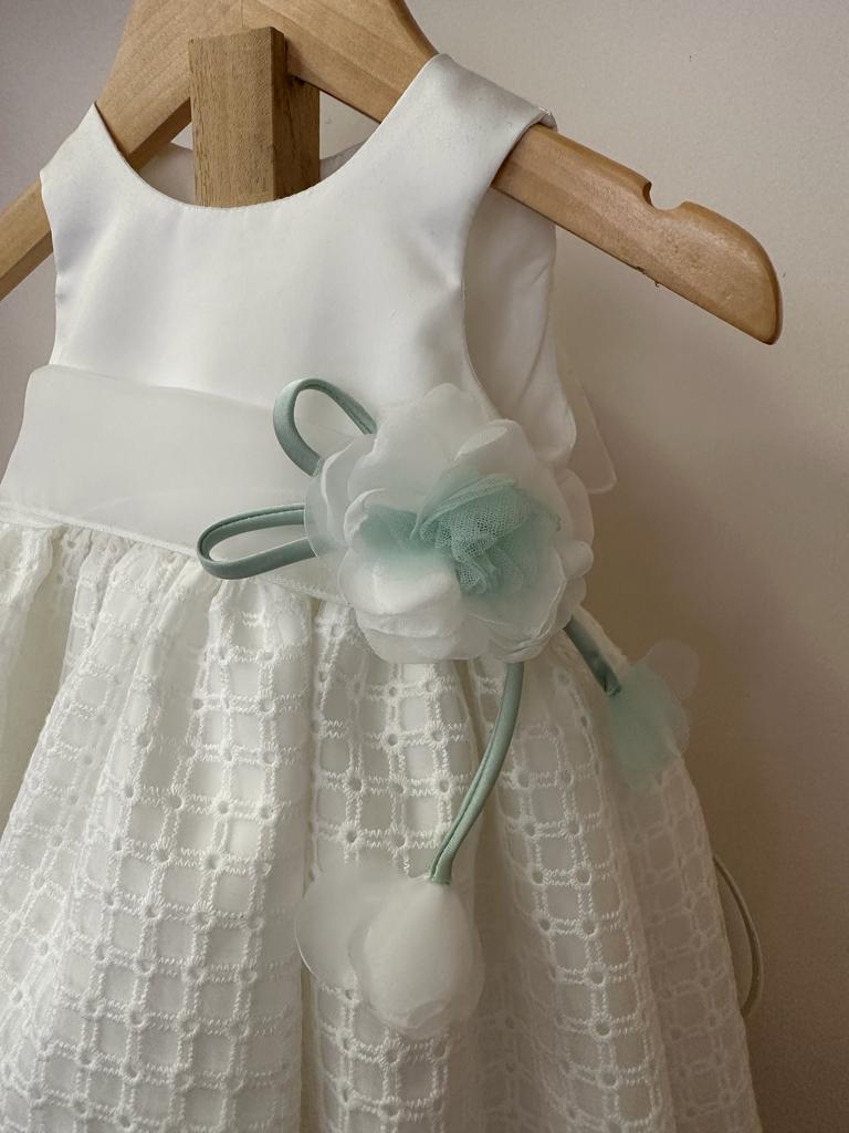 Abito Ambarabร da cerimonia con corpino in raso con gonna e cintura in organza ricamata e fodera 100% cotone, applicazione fiore verde acqua con punto luce centrale