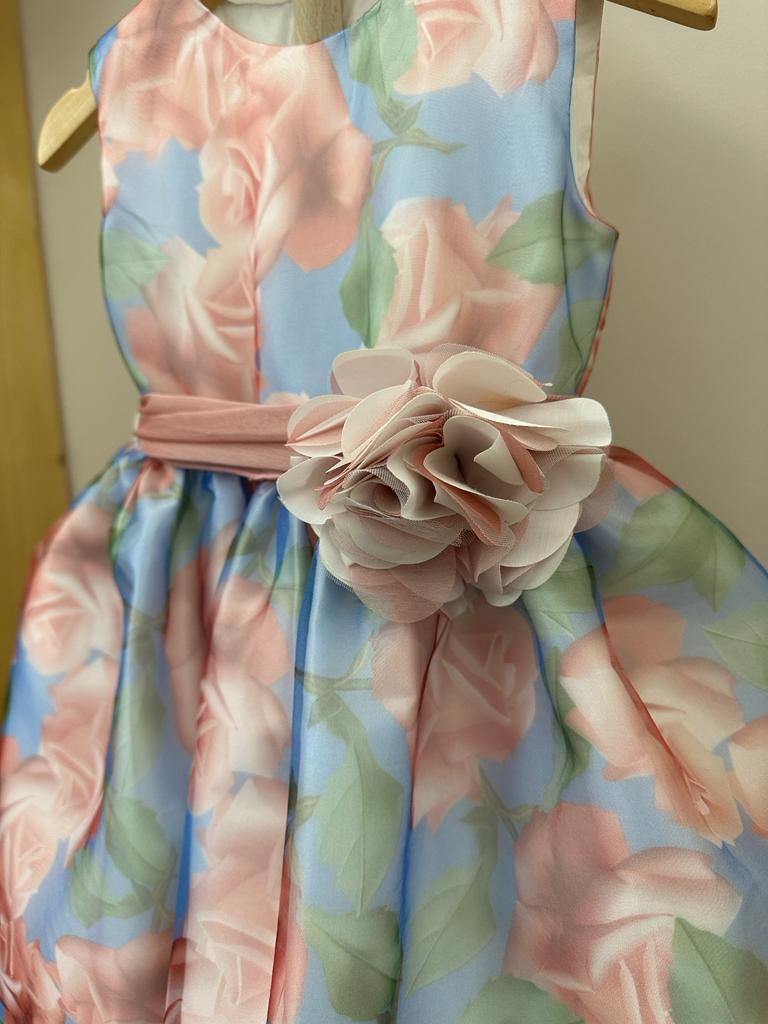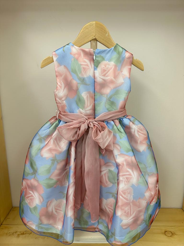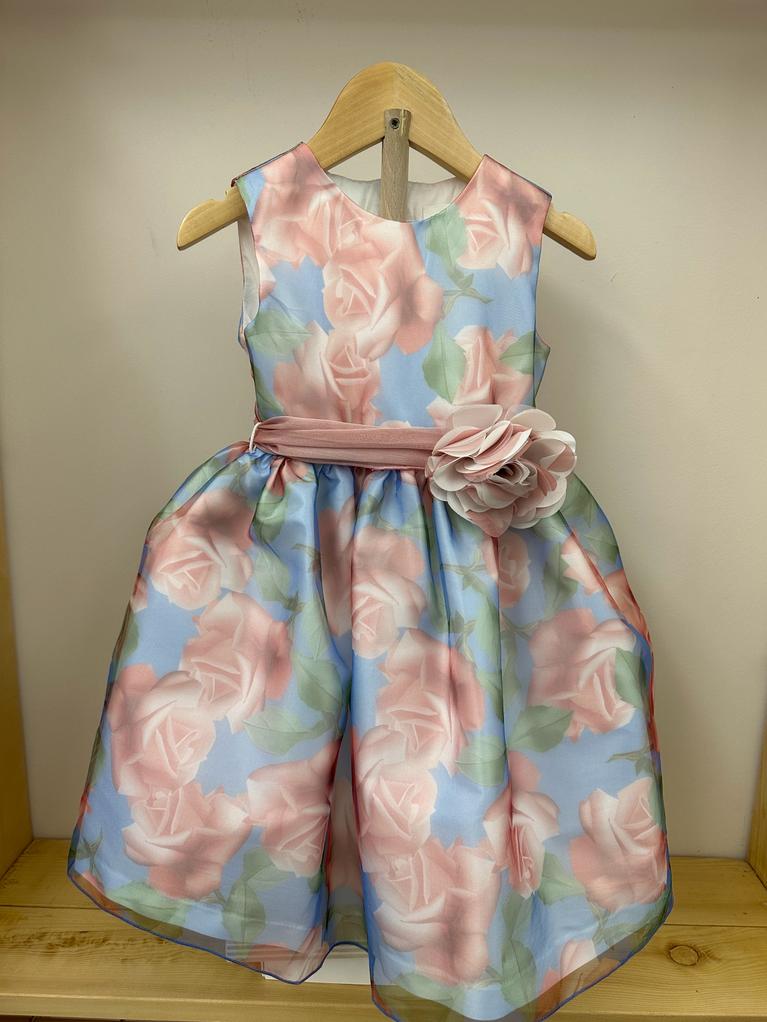 Abito celeste Dilù cerimonia in organza ricamata con rose e cintura in vita
