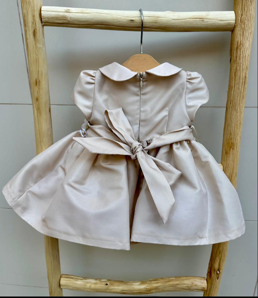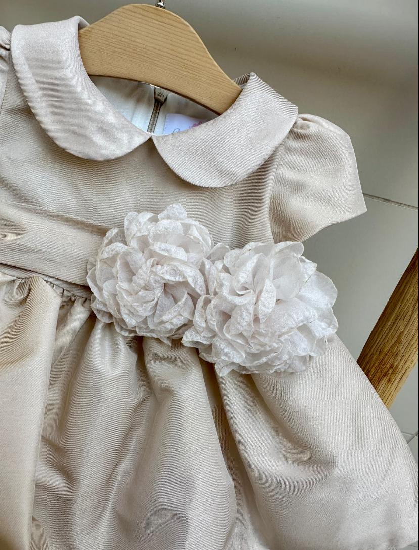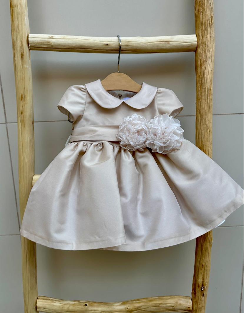 Abito da cerimonia color champagne con cintura in vita con roselline
