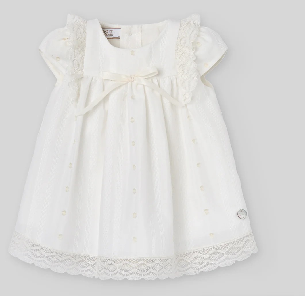 Abito in cotone batista color crema con ricami punto pintuck e pois, ricami in pizzo sulle spalle e sul fondo della gonna, applicazione fiocchetto in raso sul corpetto.