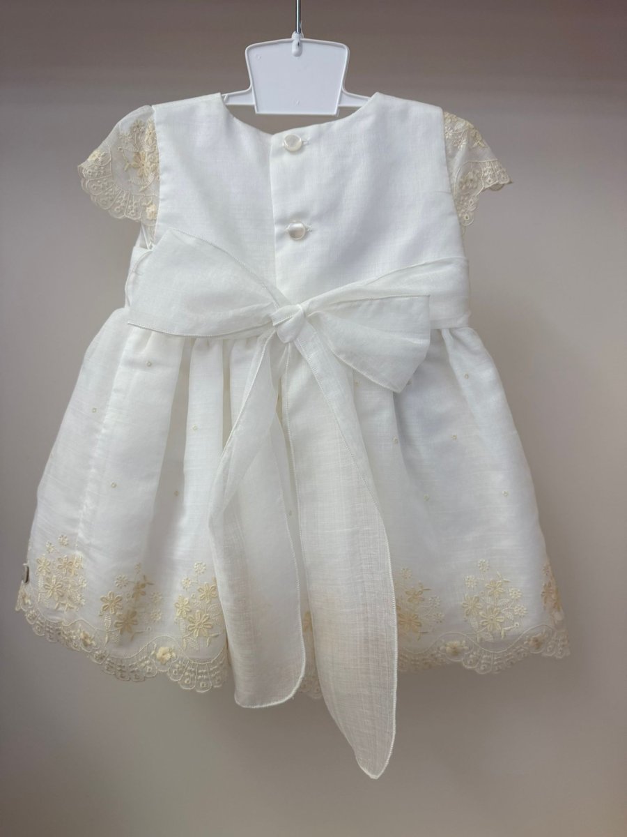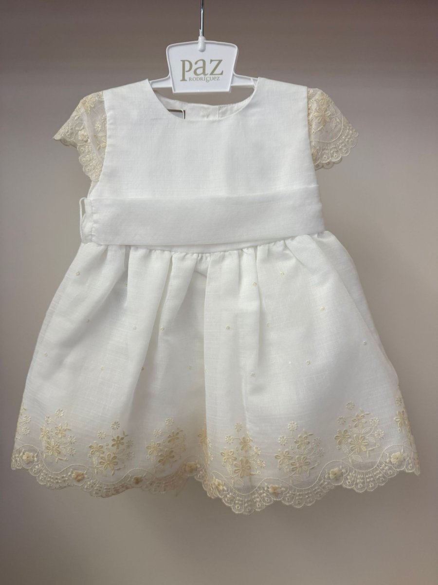 Abito in cotone, a mezza manica con ricami beige, cintura in vita, con ricami sulla parte inferiore, chiusura con bottoni sul retro