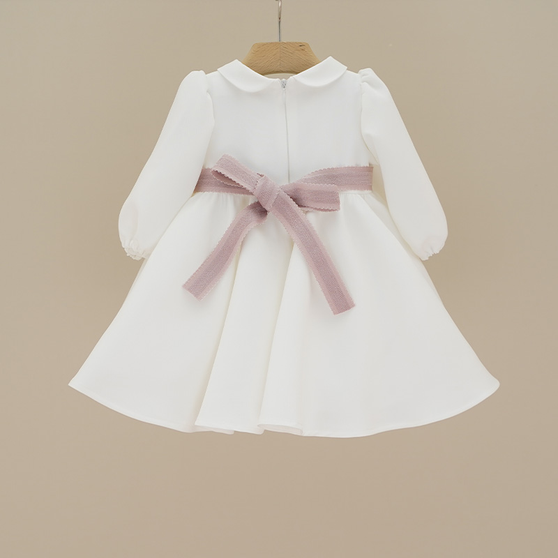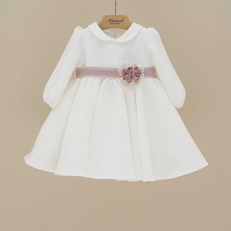 Abito da cerimonia colore bianco a manica lunga, tessuto crepe, cinturina in vita colore rosa antico con applicazione fiorellino, chiusura con zip nella parte posteriore