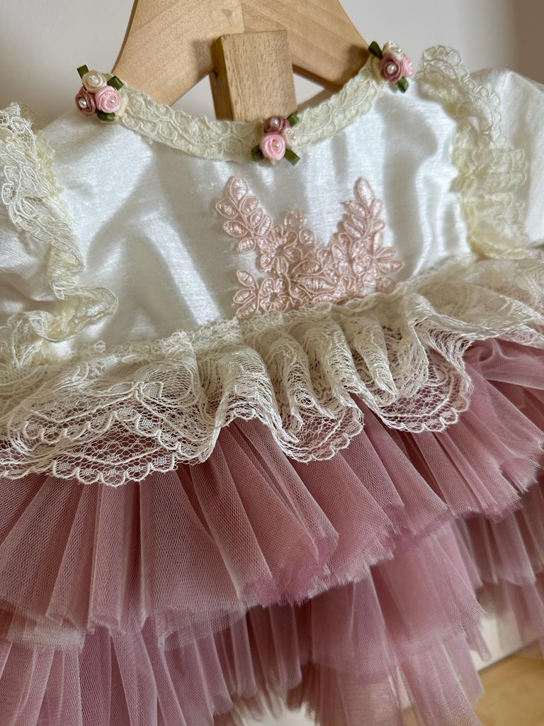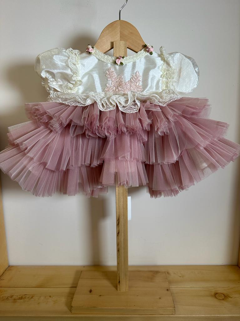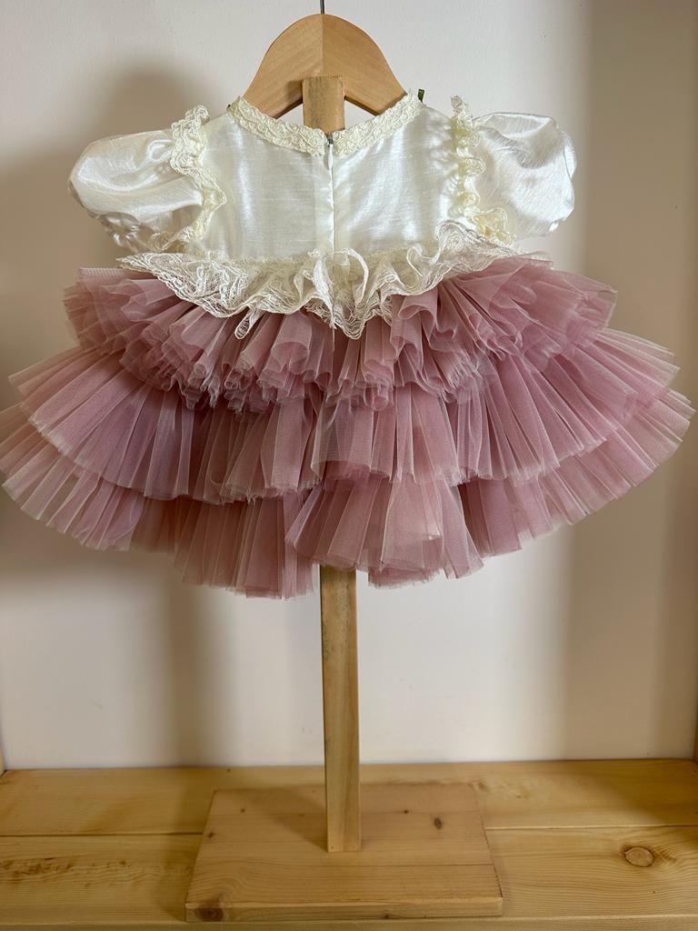 Abito da cerimonia in tulle rosa e bianco con applicazioni fiorellini