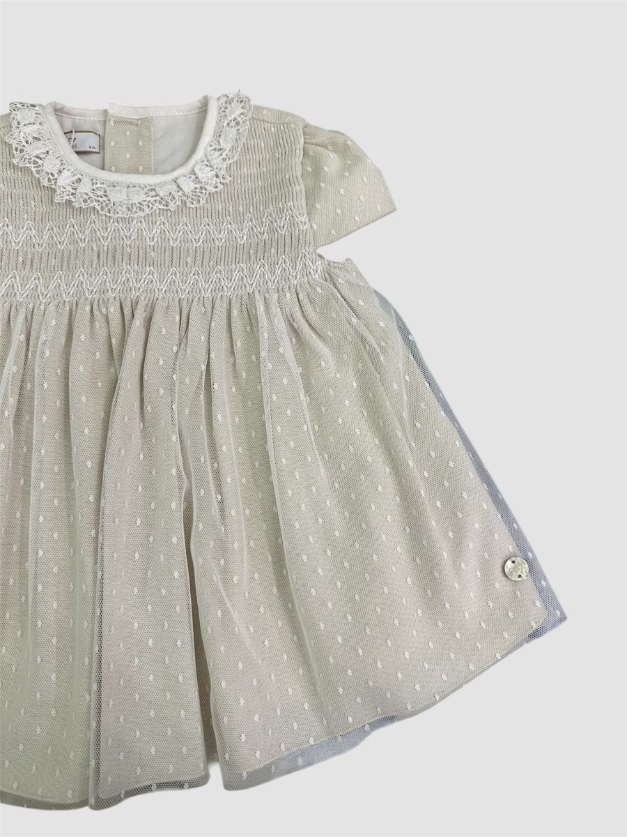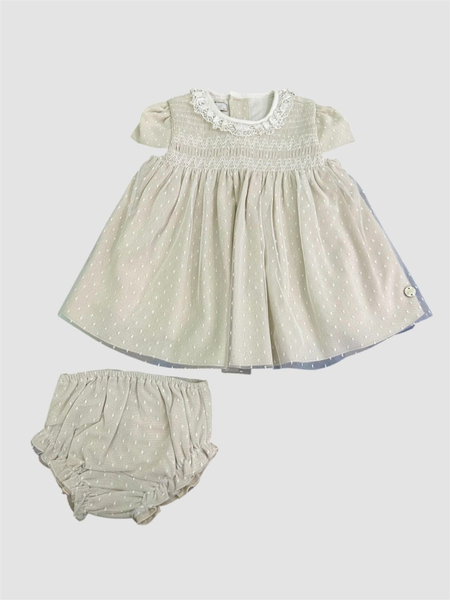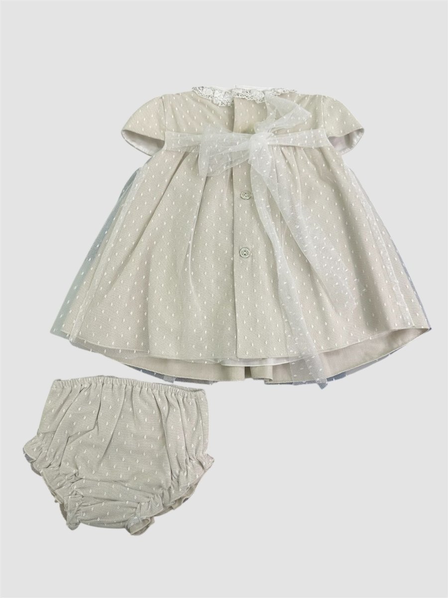 Abito con fondo in lino colore tortora con sopragonna in tulle con micropois, punto smock nella parte del corpetto e collettino in pizzo ricamato. Culotte coordinata. Chiusura con bottoncini e cinturina a fiocco sulla parte posteriore.
