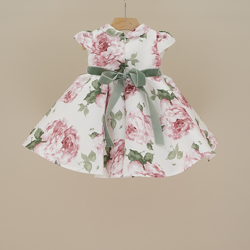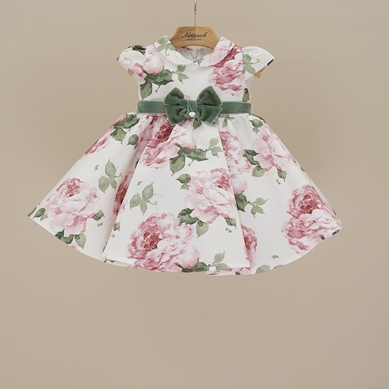 Abito da cerimonia in raso fondo bianco con stampe floreali colore verde e rosa, cinturina in vellutino con fiocco verde in vita, chiusura con zip nella parte posteriore