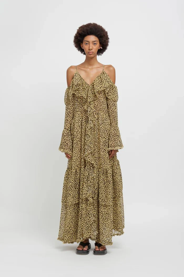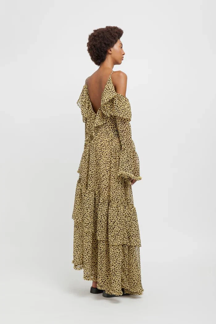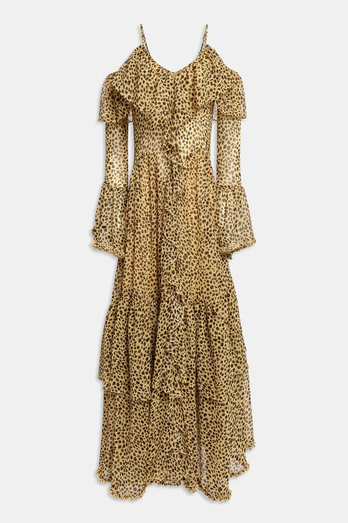 Abito in chiffon semitrasparente con balze e spalle scoperte.