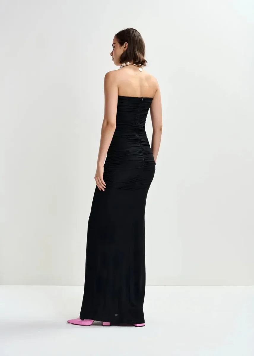 Maxi abito dalla silhouette senza spalline e dalla forma aderente che segue il corpo. Le increspature scultoree esaltano l’aspetto pulito, mentre un raffinato cut-out frontale crea un sobrio richiamo visivo. Rifinito con una zip nascosta e chiusura a gancio per garantire un aspetto lineare e ordinato.