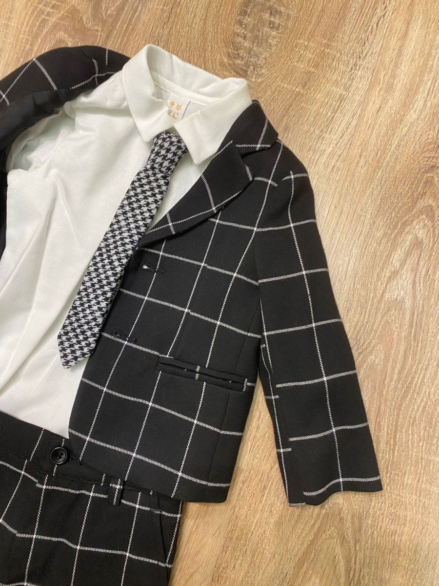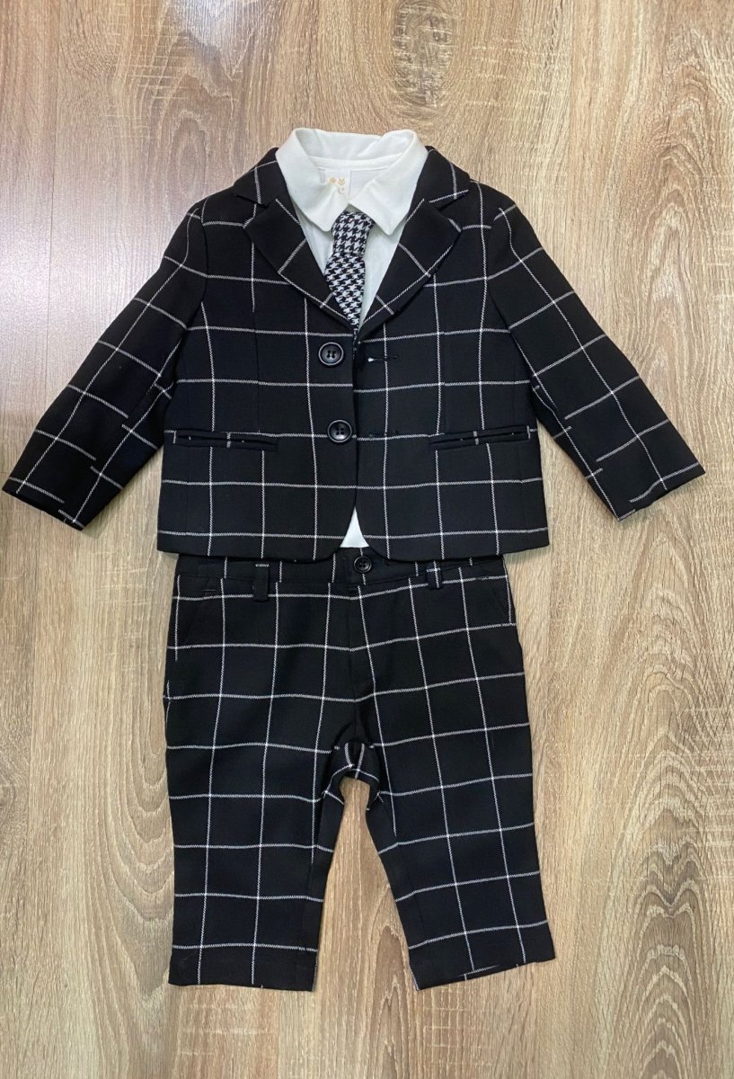 Abito completo di giacca, pantalone, camicia e cravatta colore bianco e nero