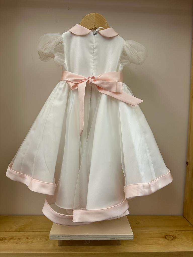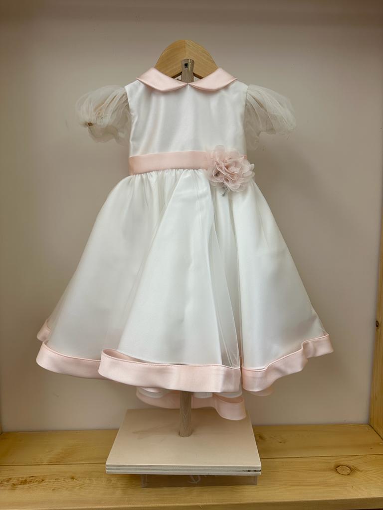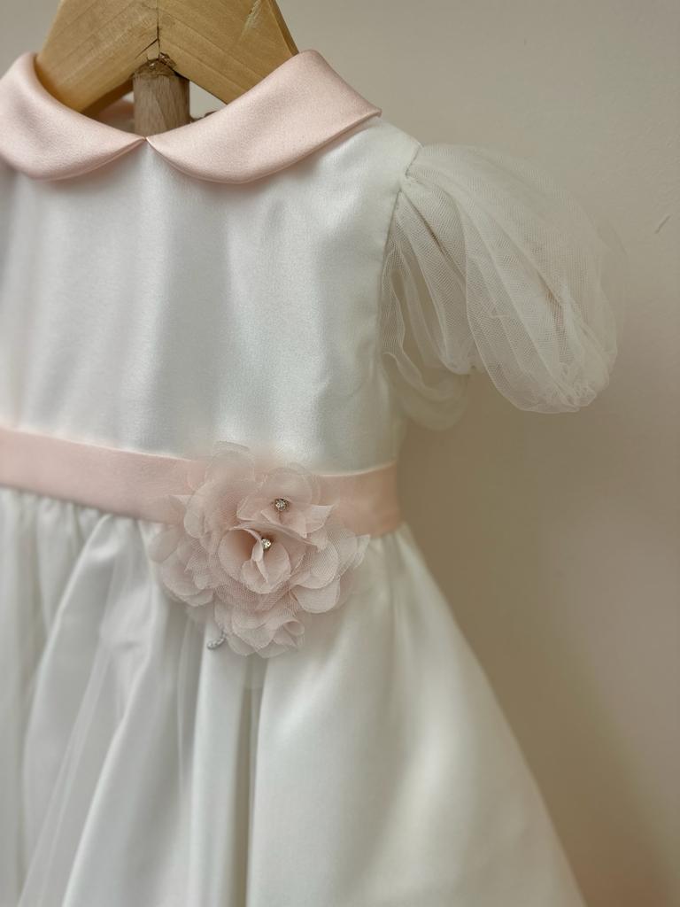 Abito bianco con colletto, cintura, fiore e bordo gonna colore rosa, corpetto in mikado con gonna e maniche in tulle