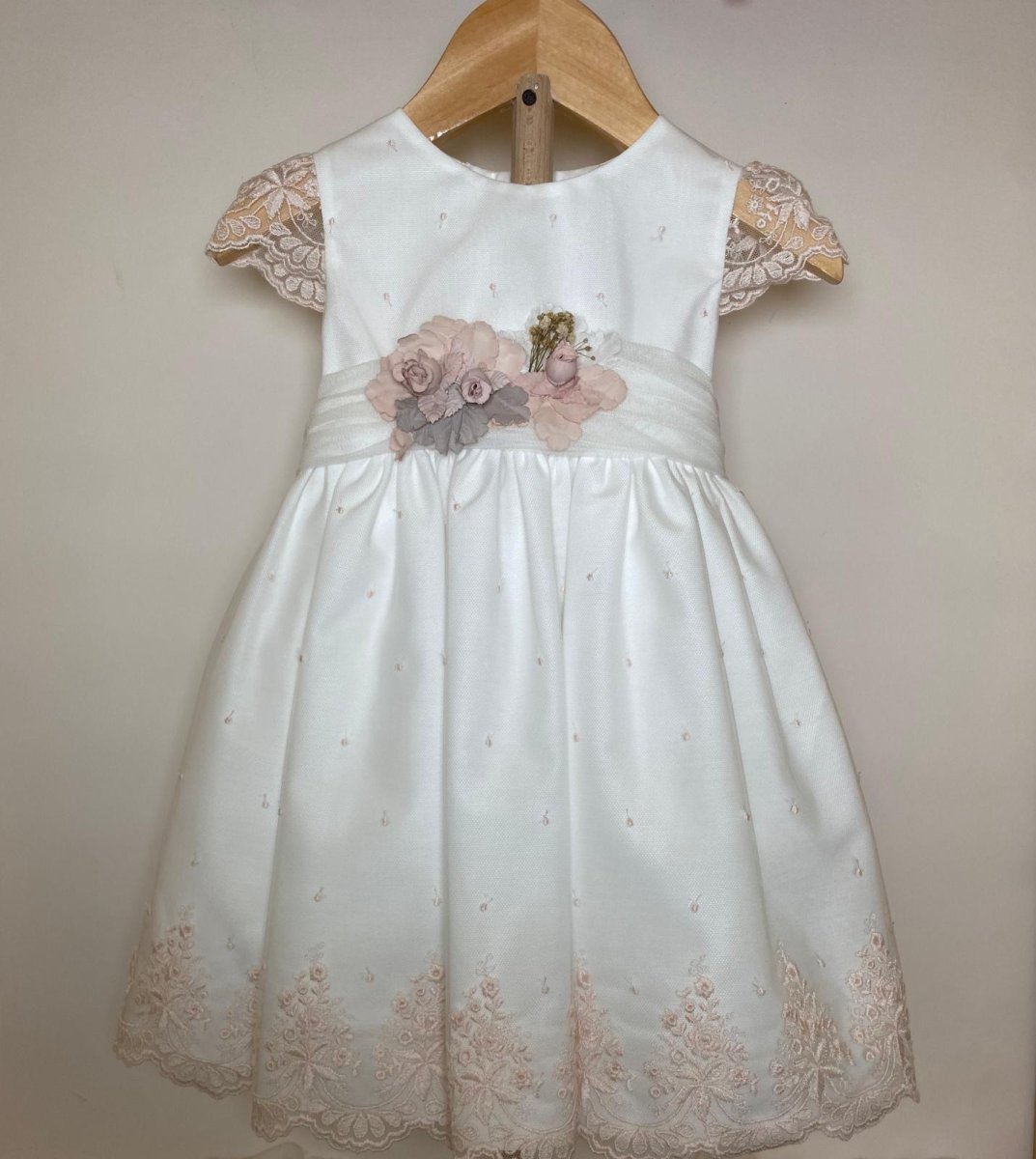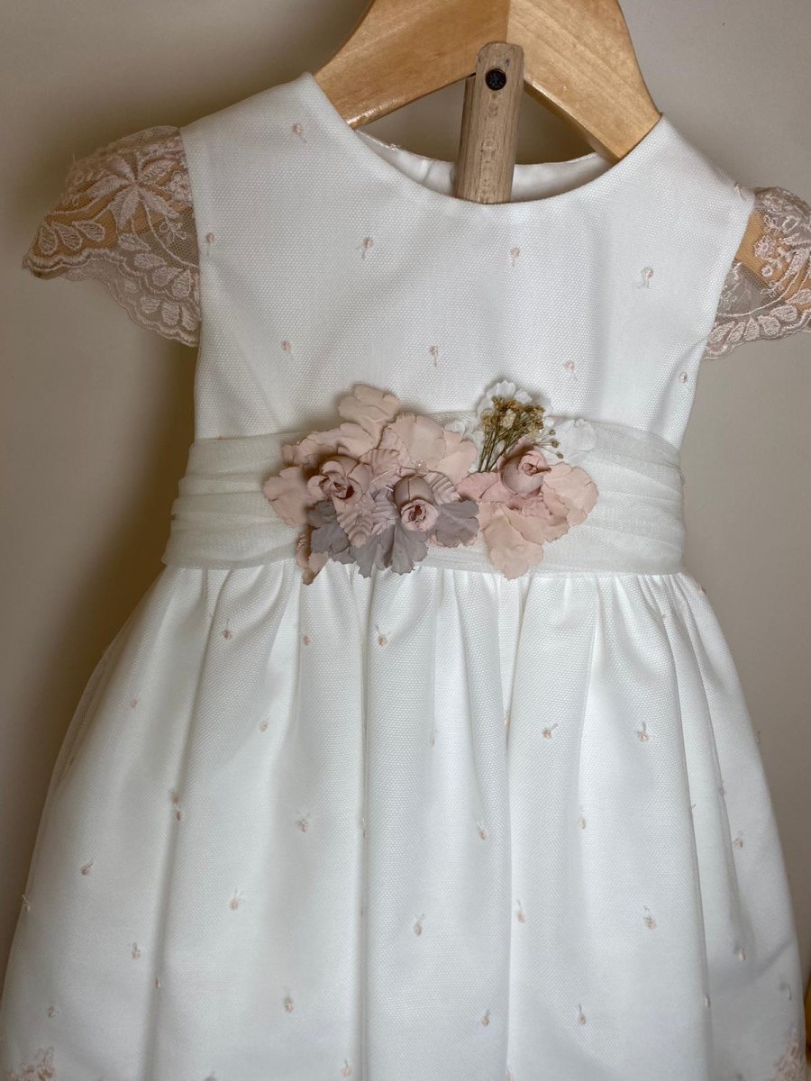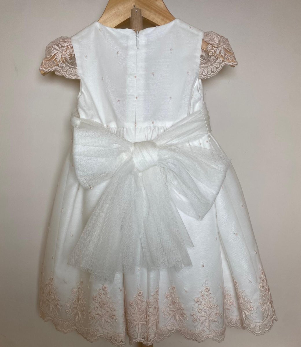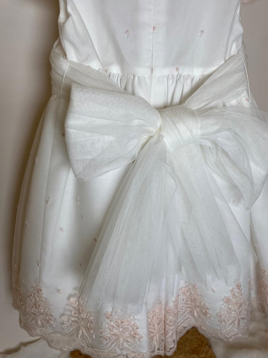 Abito da cerimonia con fondo bianco e pizzo rosa sulle maniche e sul fondo della gonna, con cintura in organza e applicazione fiorellini e fiocco nella parte posteriore
