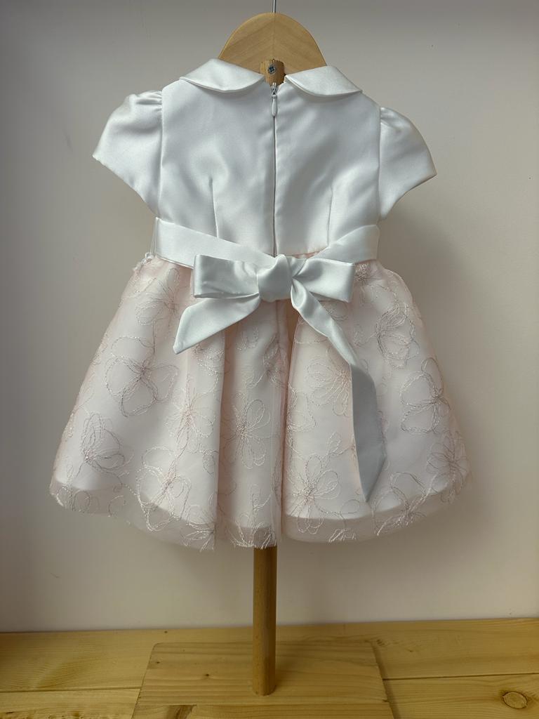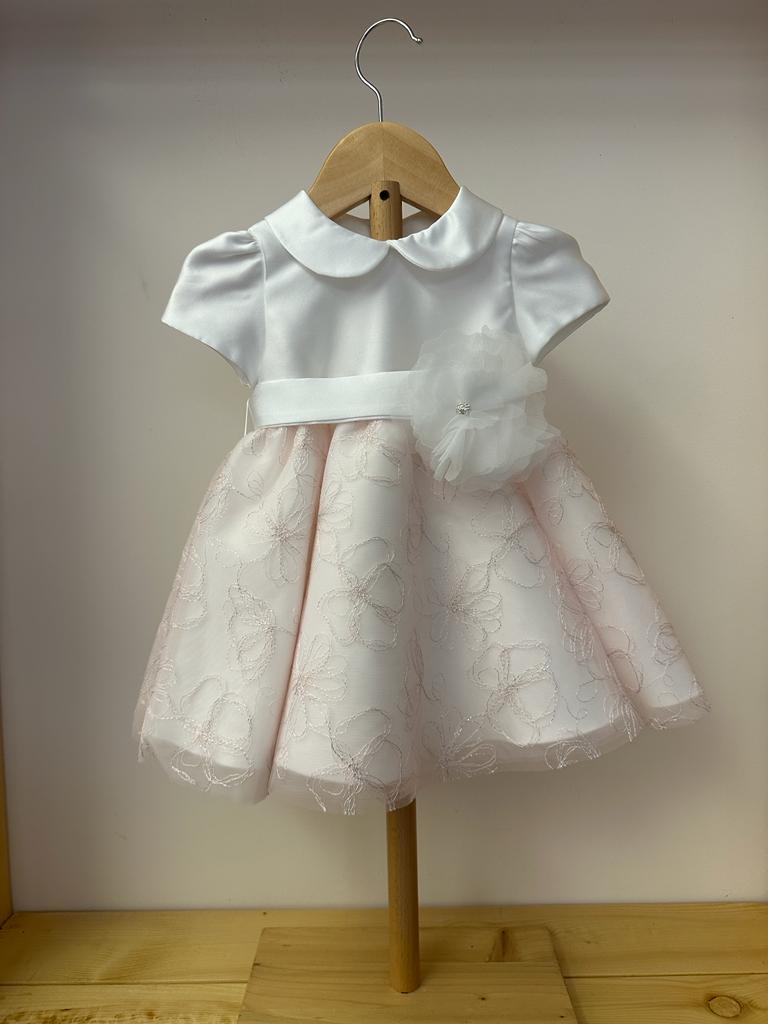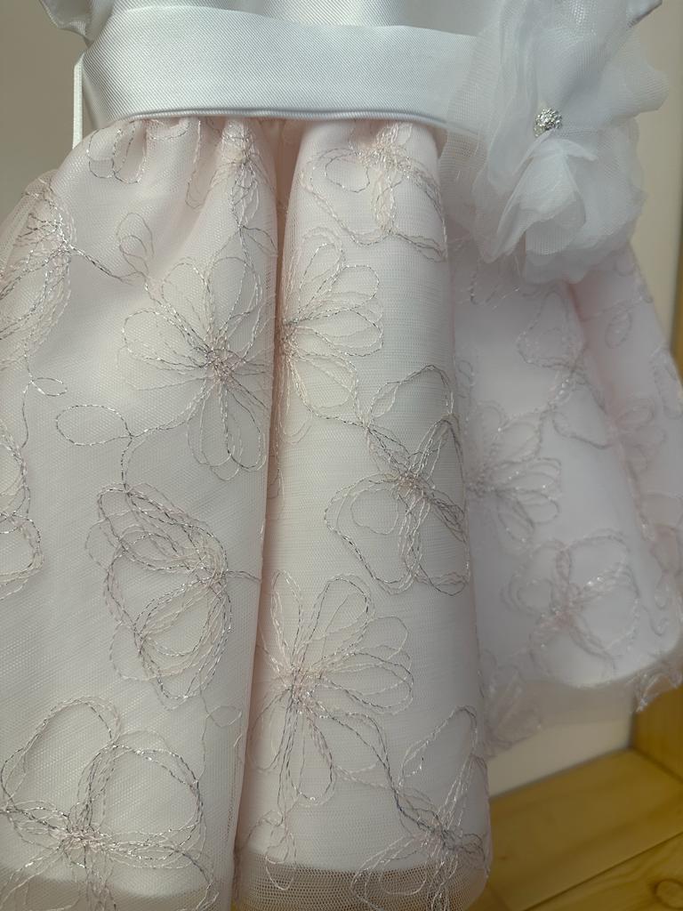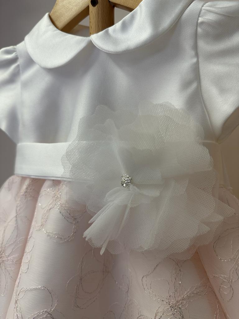 Abito cerimonia con corpetto bianco e gonna rosa in tullè con fiori argentati e cintura in vita con fiore removibile