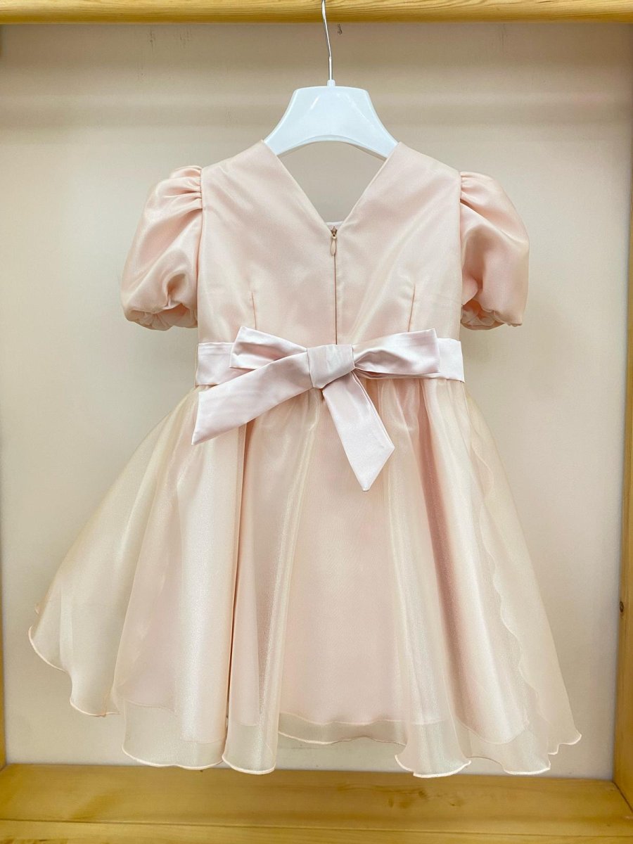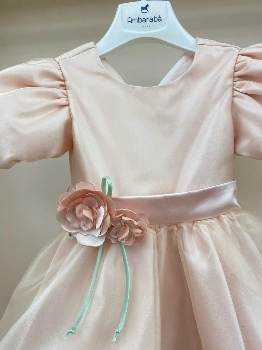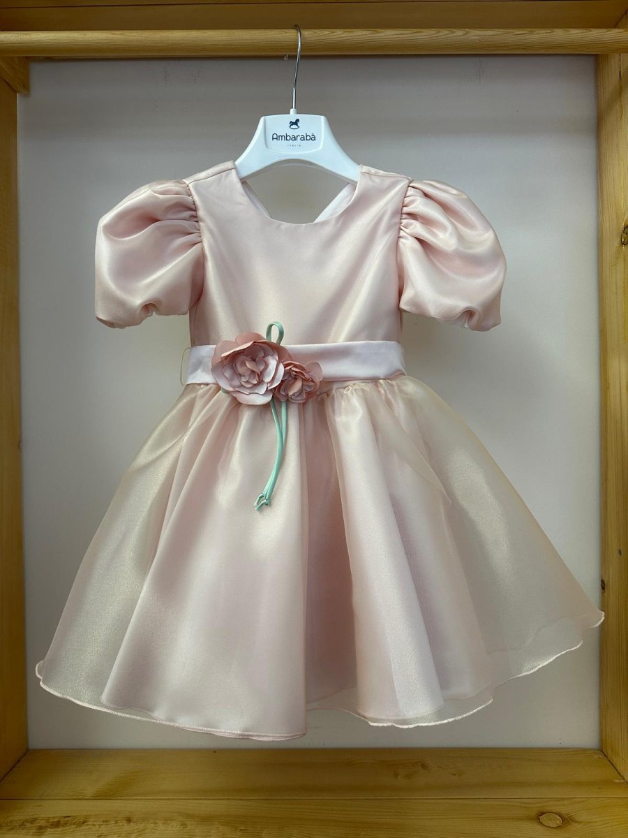 Abito rosa, in organza, mezza manica a palloncino, con cintura amovibile