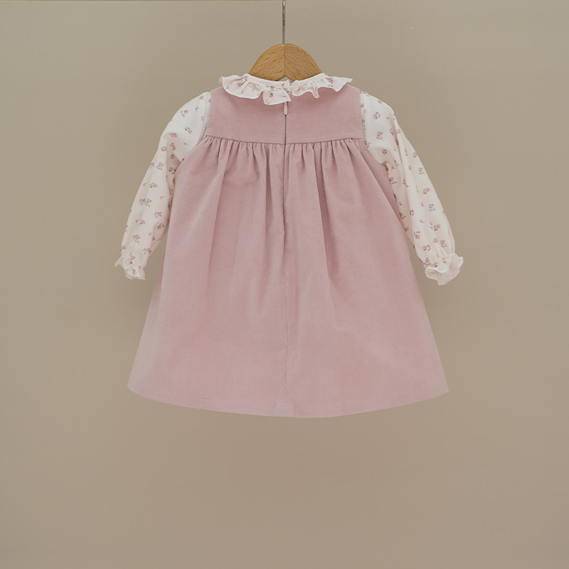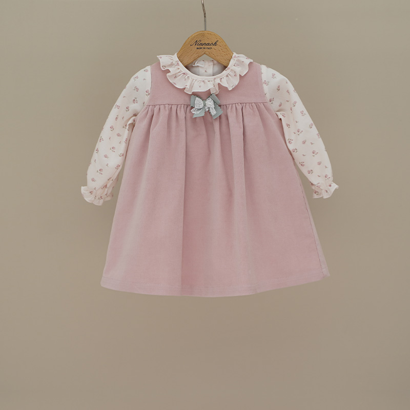 Abito scamiciato in velluto rosa con camicina a body rosa chiaro fantasia fiorellini