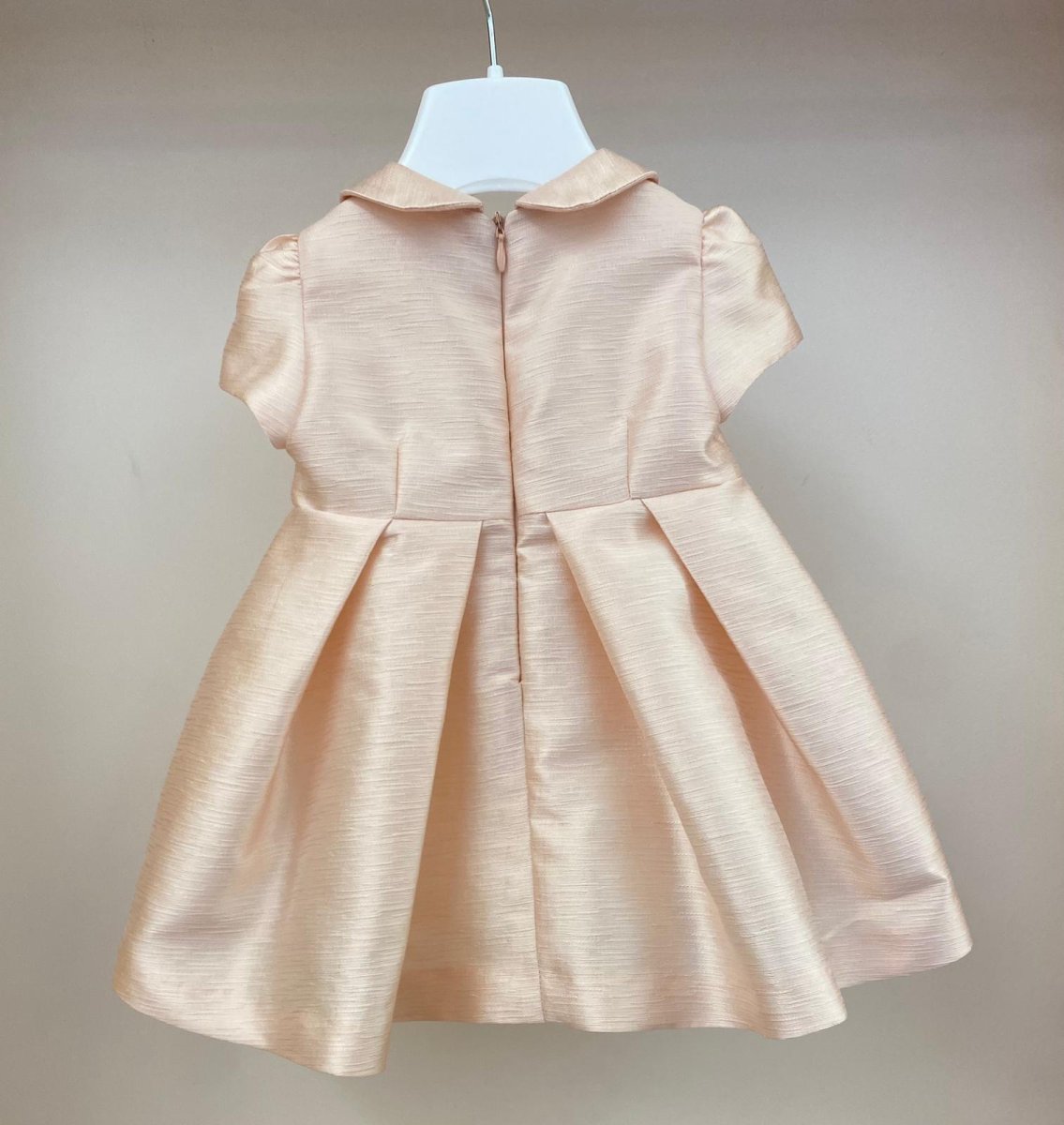 Abito a mezza manica, con spilla removibile di roselline in vita e chiusura con zip sulla parte posteriore