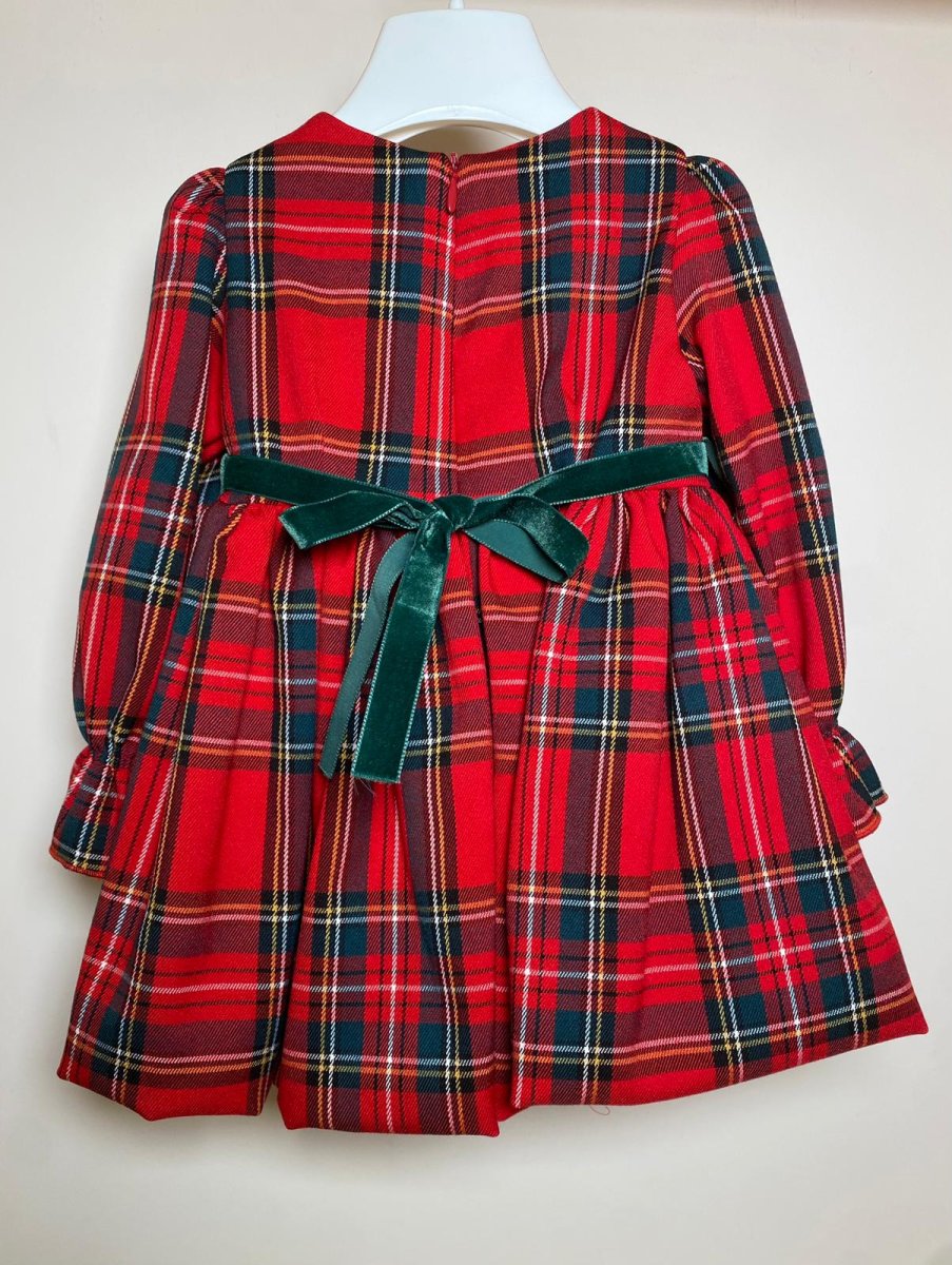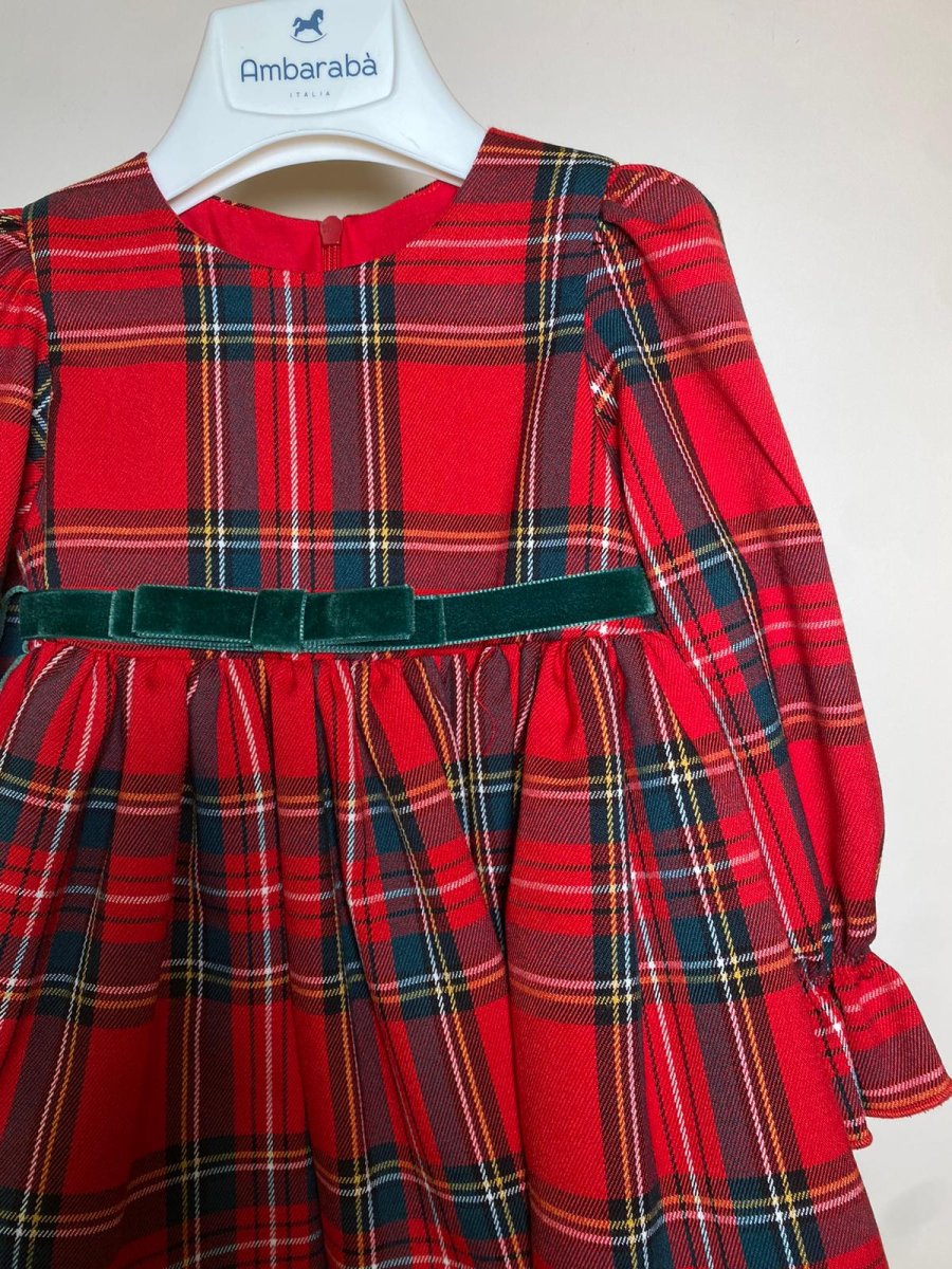 Abito a manica lunga fantasia tartan con cinturina in vita colore verde in velluto, chiusura con zip sulla parte posteriore