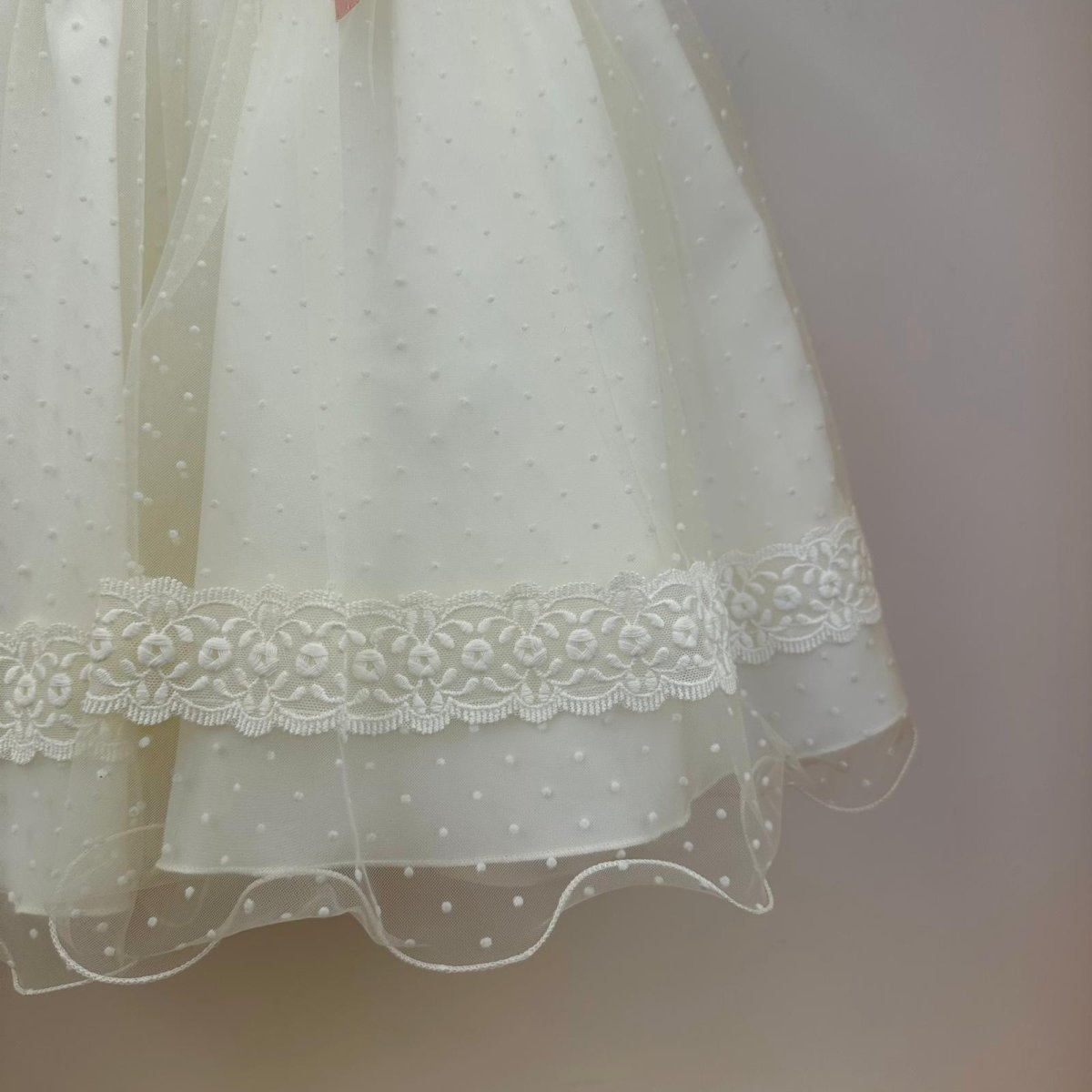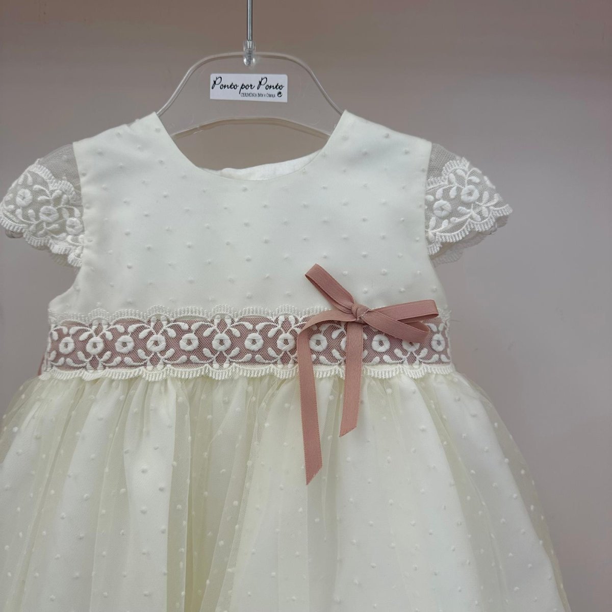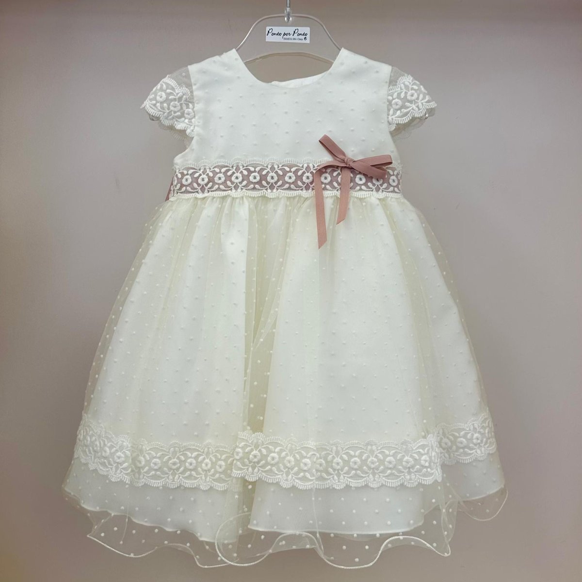 Abito da cerimonia con tulle panna, ricamato, con micro pois e cintura in vita rosa antico con applicazione fiocchetto e chiusura posteriore con bottoncini e fiocco.
