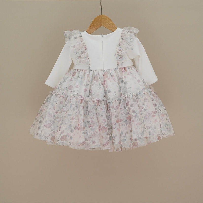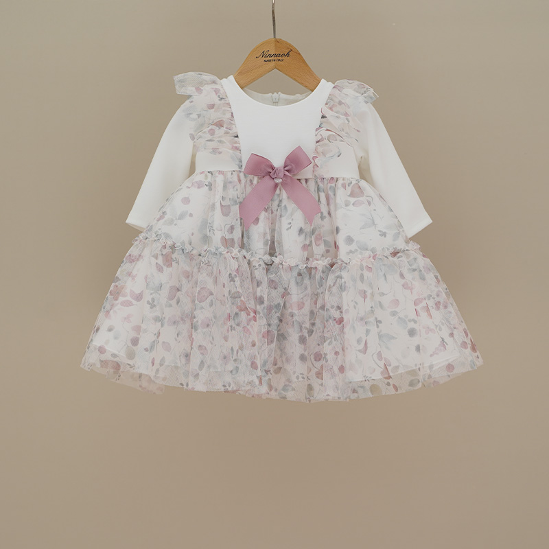 Abito a manica lunga colore panna con tulle a fantasia fiorellini rosa a verdi