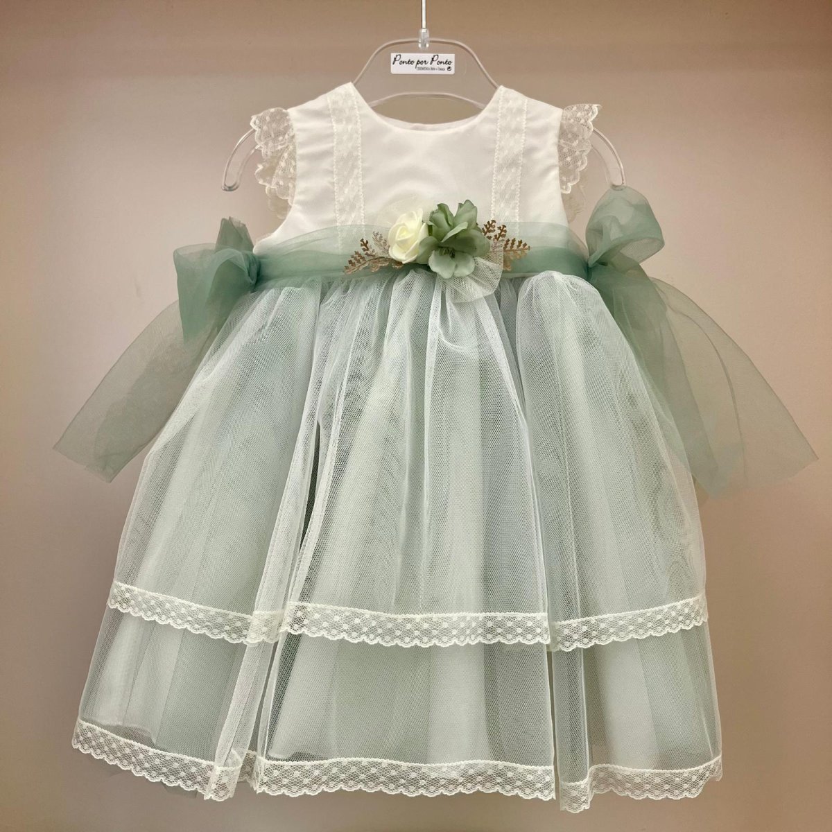 Abito verde e bianco con pizzo e tulle verde salvia, fiocchi e fiori Ponto por Ponto 100% poliestere