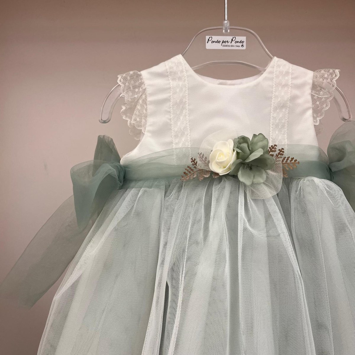 Abito verde e bianco con pizzo e tulle verde salvia, fiocchi e fiori Ponto por Ponto