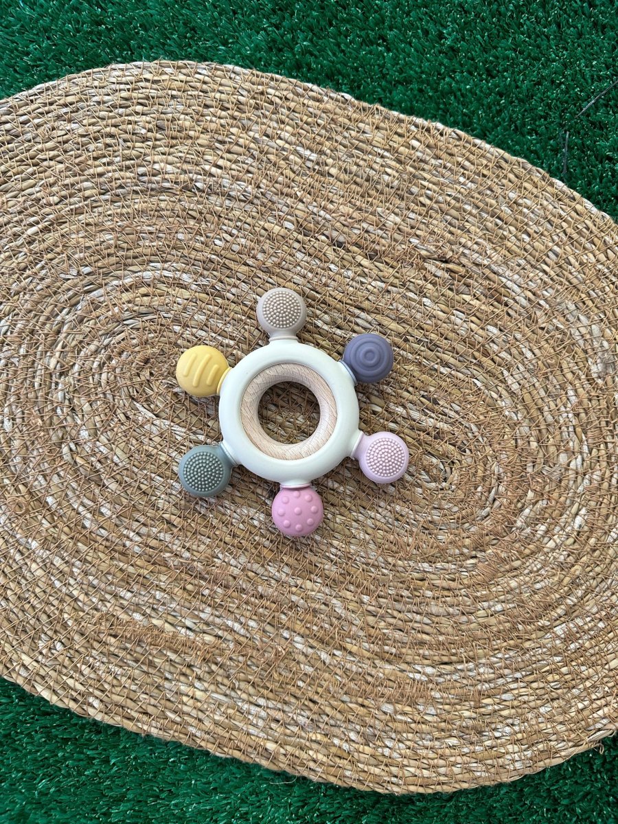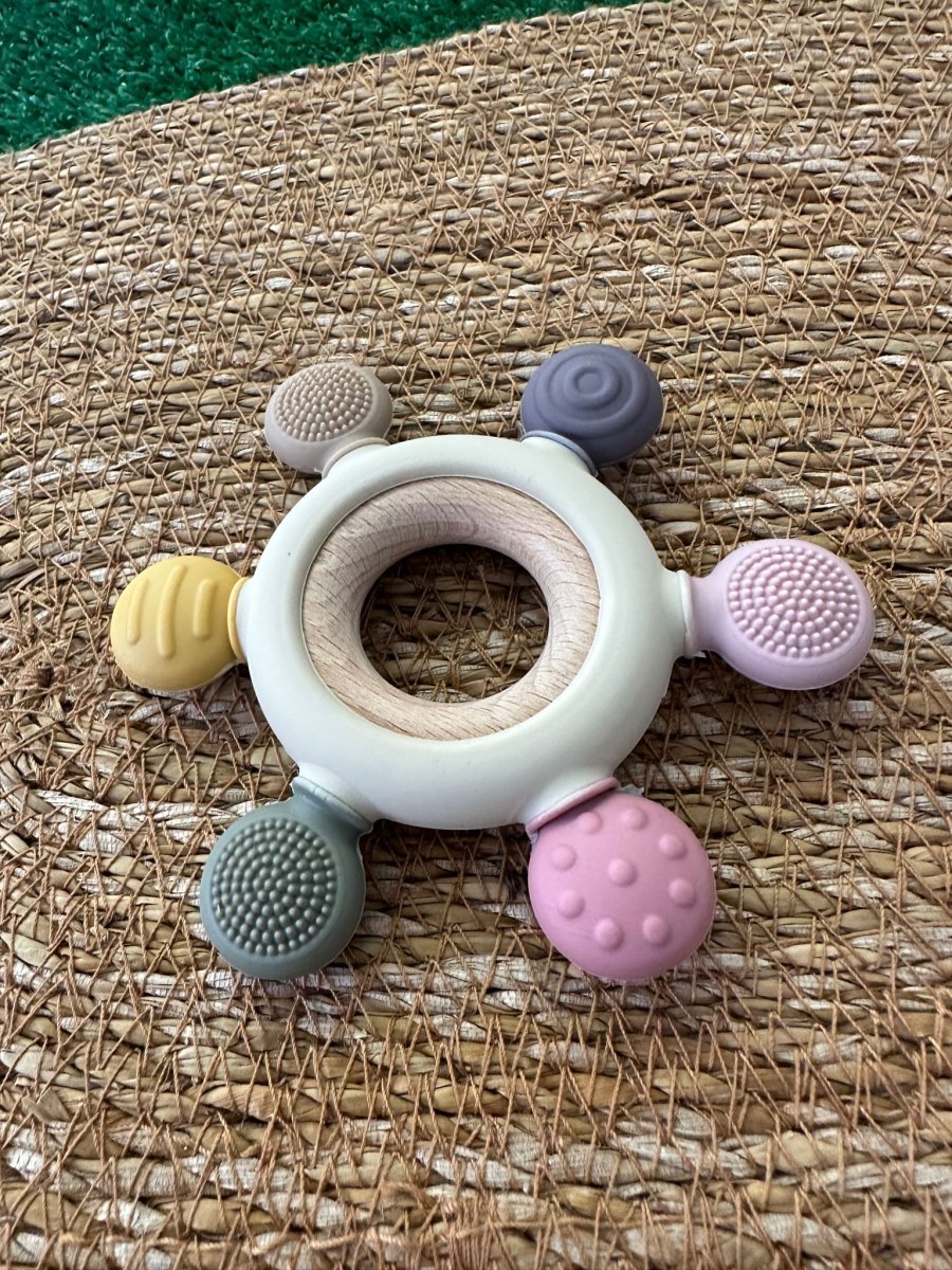 Anello dentizione in legno con massaggiagengive in gomma naturale colorata