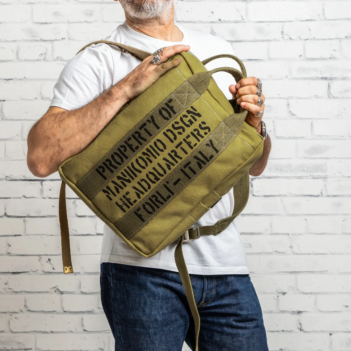 I loghi e le scritte Manikomio Design sono : serigrafati verticalmente in grande dimensione su tutto il fronte dello zaino e impressi a caldo su etichetta in cuoio, cucita sul retro dello zaino, rendendo questo accessorio un vero pezzo di artigianato italiano di altissima qualità e dal DNA caratteriale davvero forte! . Un prodotto dal fascino esclusivo perfetto per chi ama gridare le proprie scelte di stile .