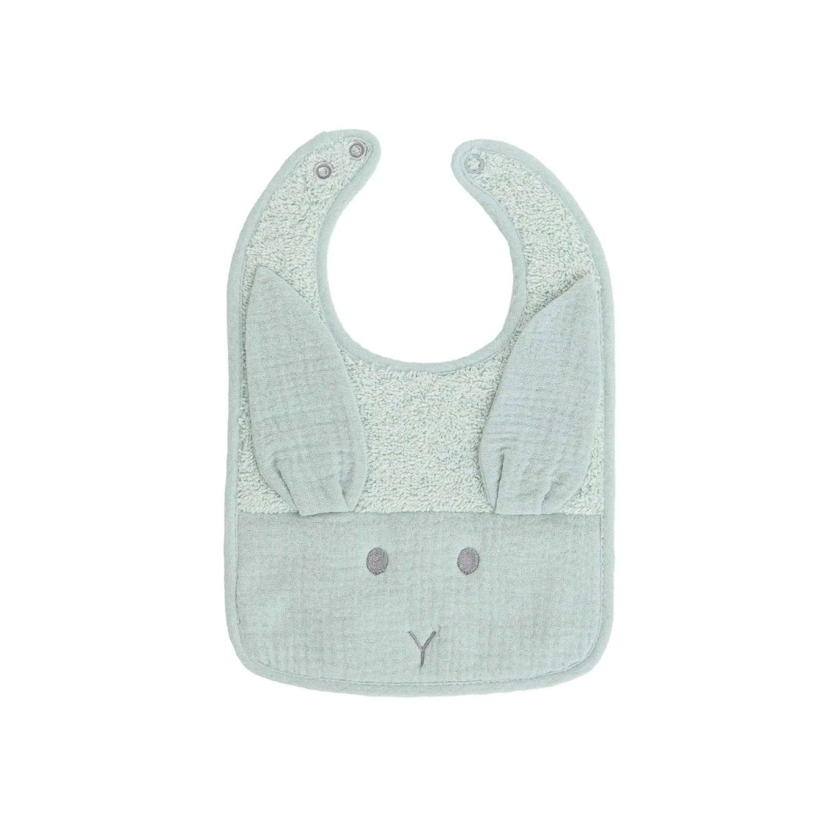 Bavetta in spugna e mussola, colore verde salvia, con simpatiche orecchie da coniglietto e occhi e nasino ricamati