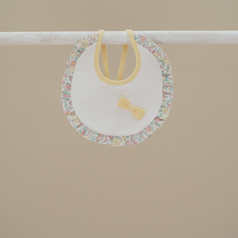 Bavetta con applicazione fiocco giallo, fondo bianco con rouche fiorata e laccetti.