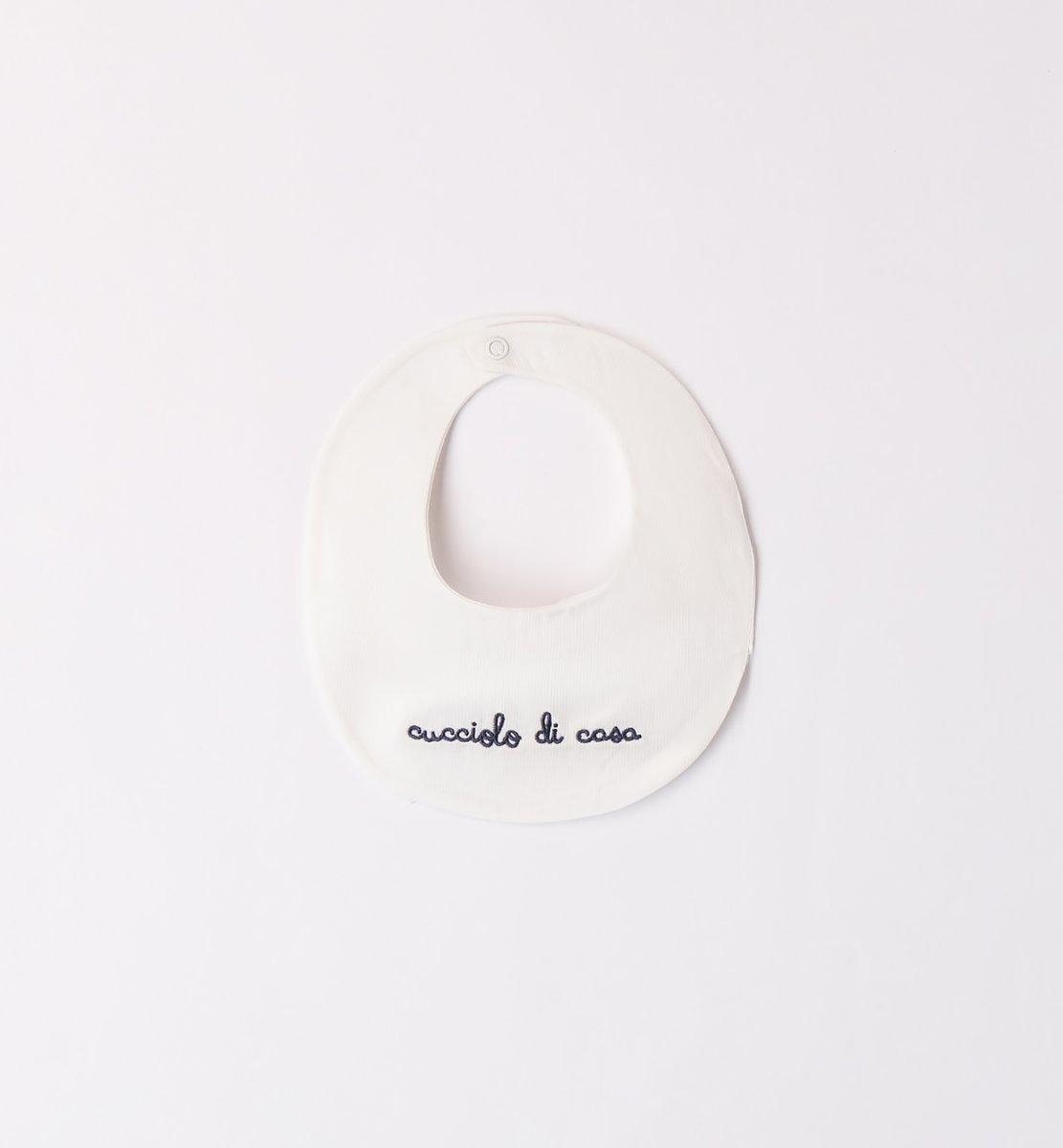 Bavetta in cotone colore bianco con scritta ricamata “cucciolo di casa” colore blu