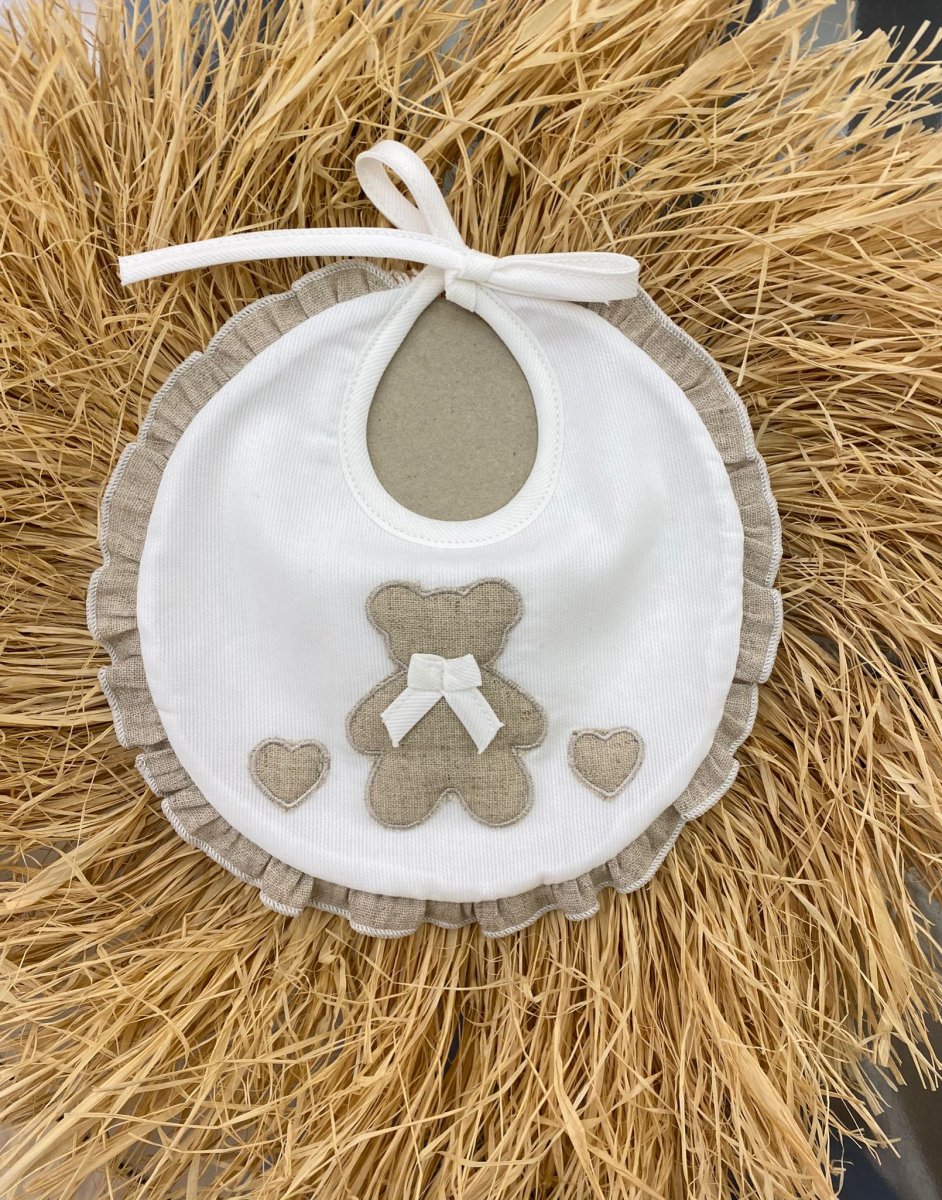 Bavetta in cotone colore bianco con ricami cuore orso cuore tortora e rouche tortora