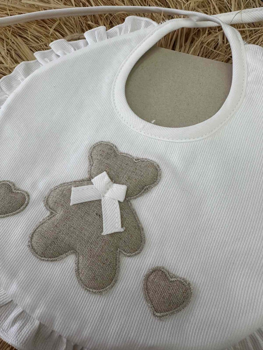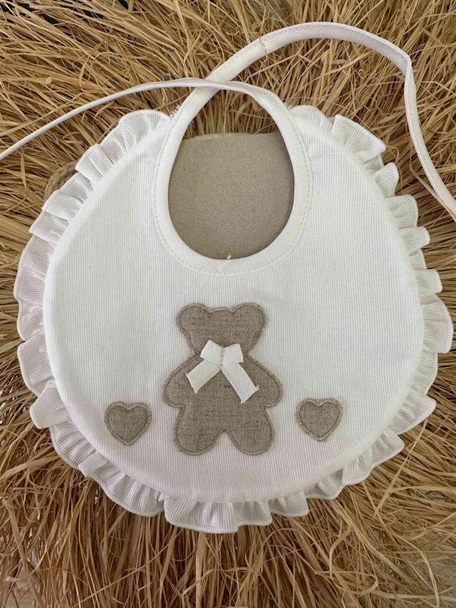 Bavetta in cotone colore bianco, con ricamo cuoricini e orsetto e rouche bianca