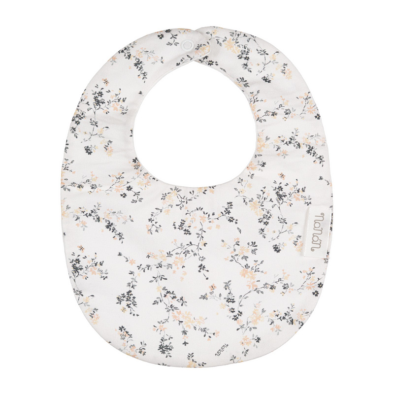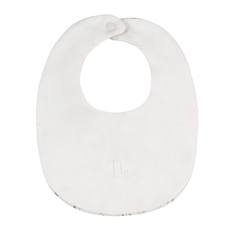 Bavetta in cotone colore bianco double-face con stampa fiorellini gialli e blu. Chiusura con bottoncini.