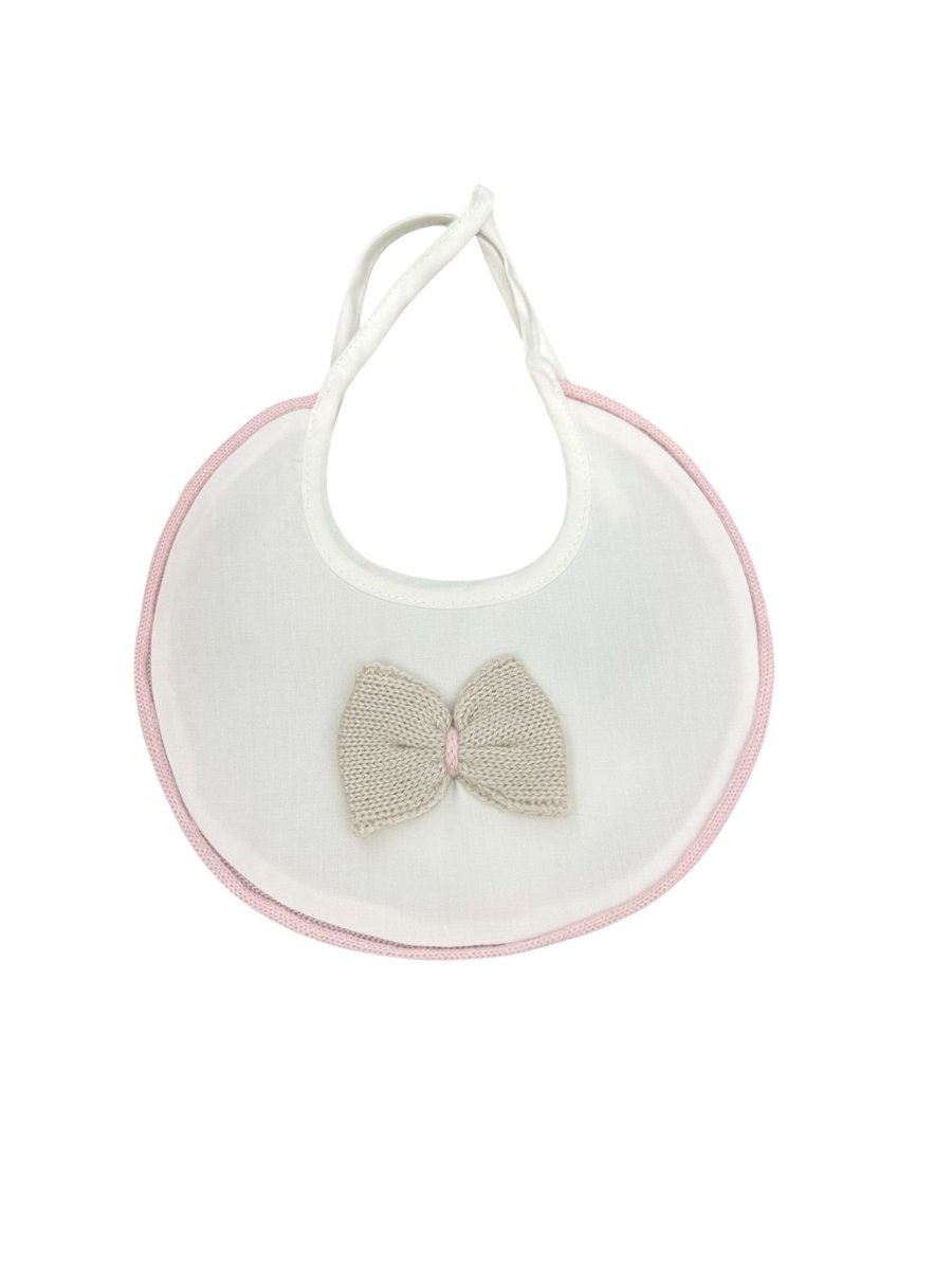 Bavetta in cotone bianco con fiocco beige applicato e profilo rosa