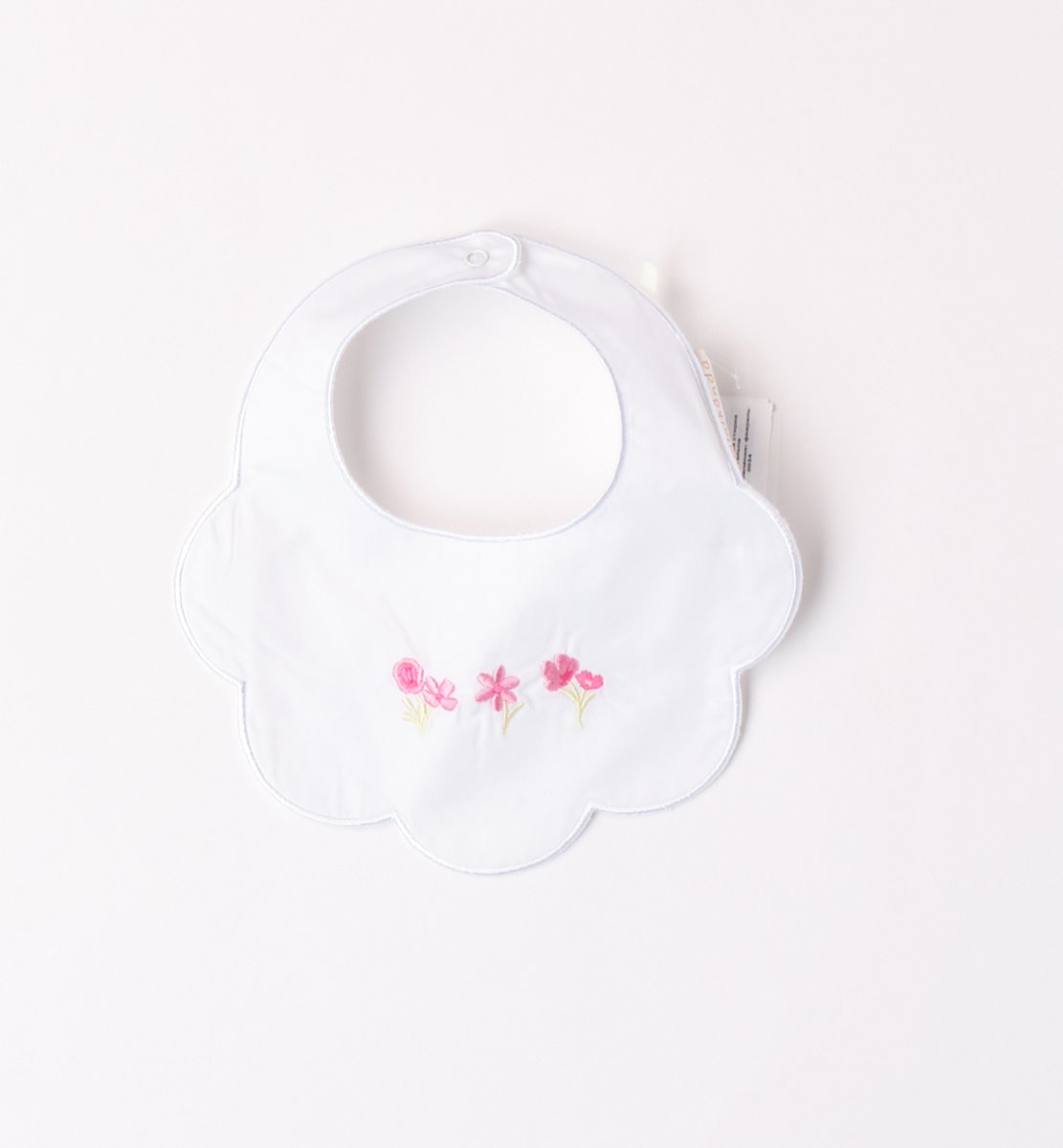 Bavetta in cotone bianco con fiori ricamati colore fucsia a forma di fiore. Chiusura con bottoncini.
