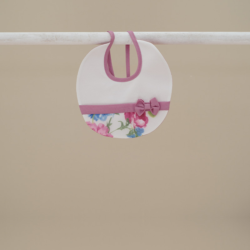 Bavetta in cotone colore bianco con stampa fiori e applicazione fiocchetto rosa antico.