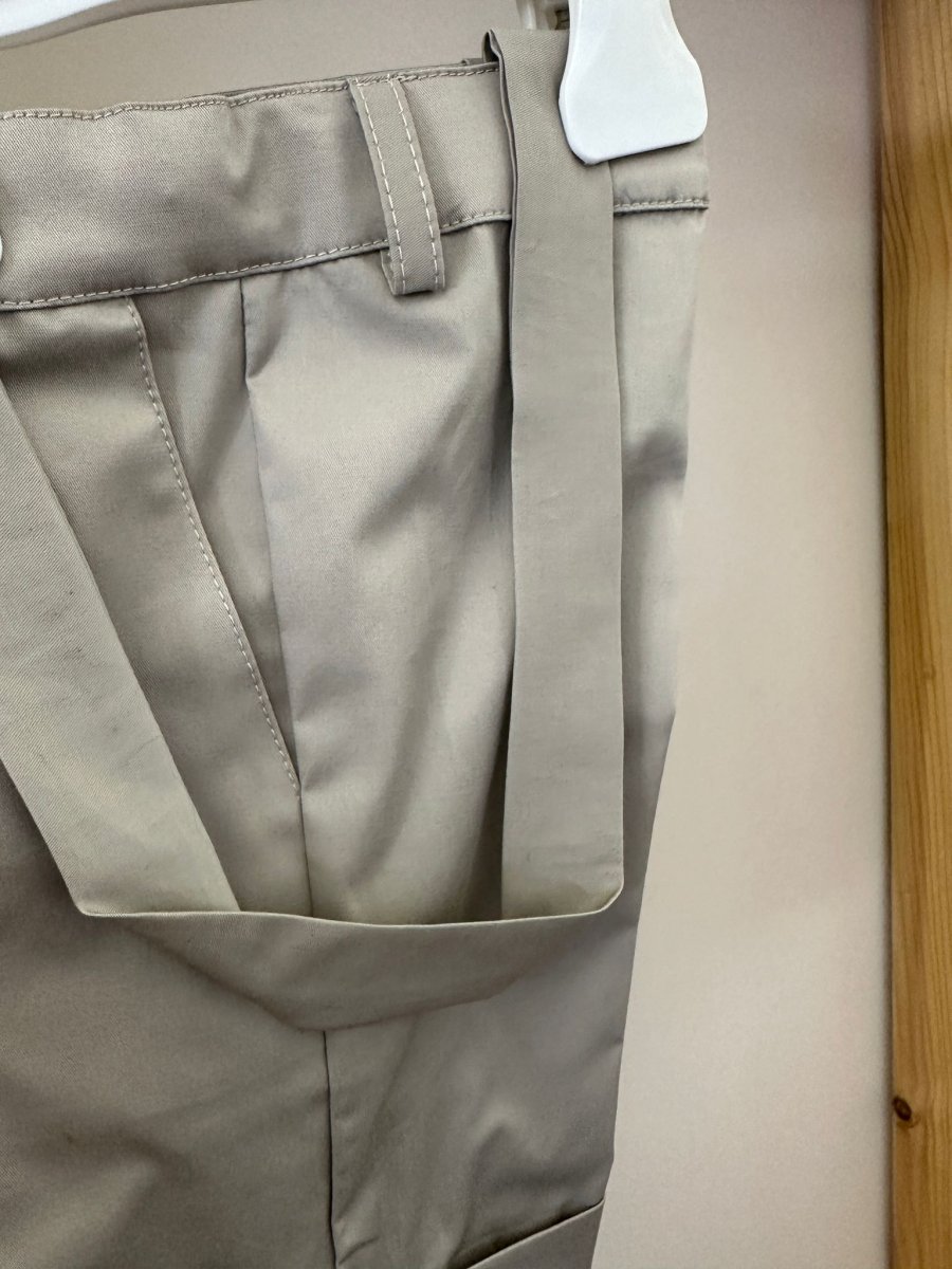 Bermuda con bretelle, colore beige effetto satinato con tasche a filo