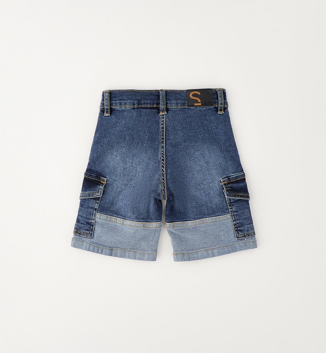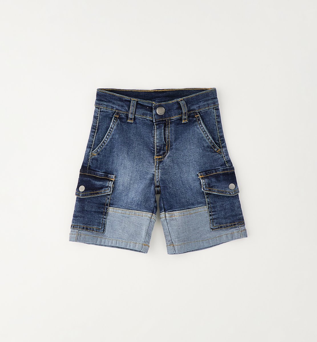Bermuda in denim doppio lavaggio, con tasconi laterali e chiusura con bottoncino, coulisse interna regolabile.