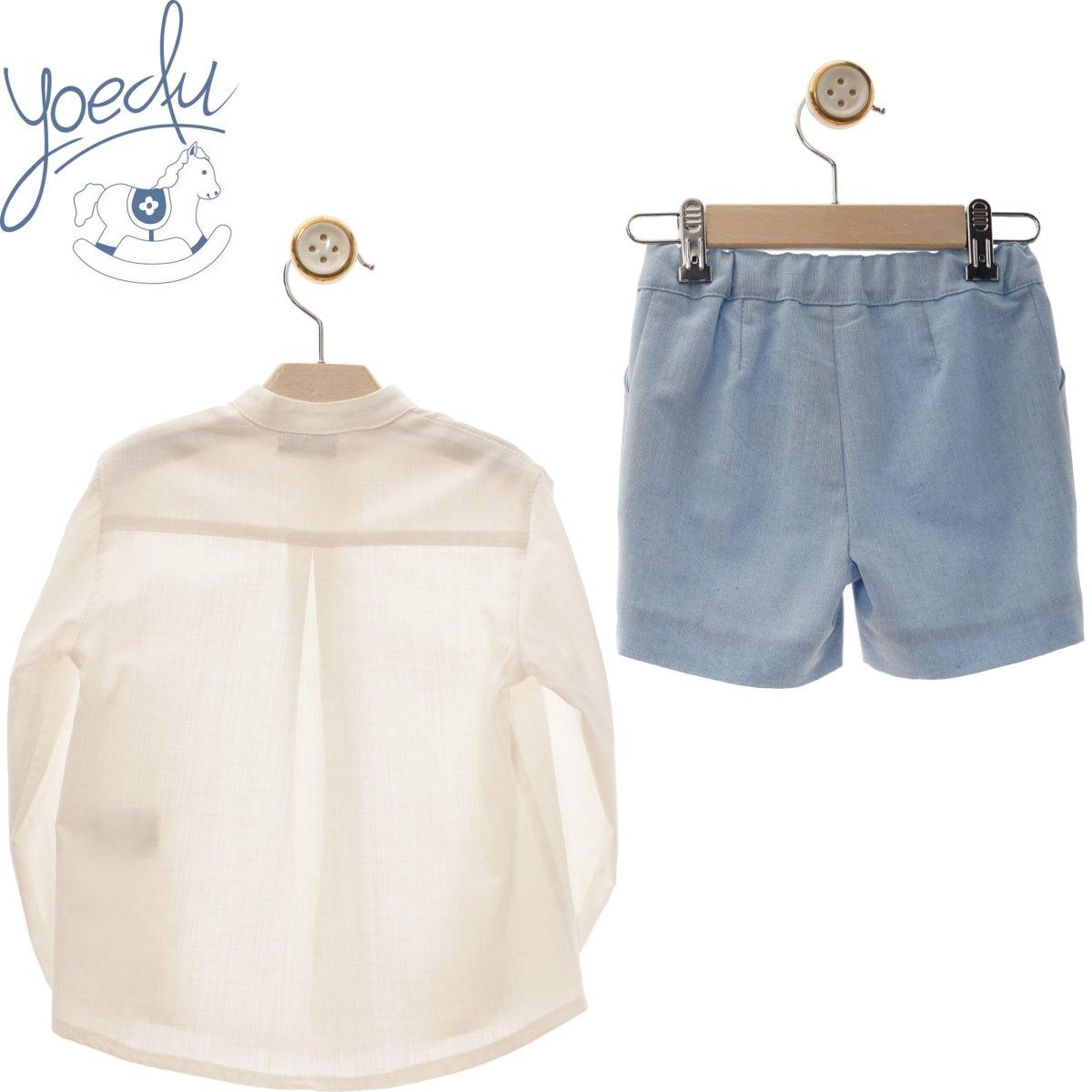 Completo due pezzi: bermuda colore celeste e camicia bianca in lino