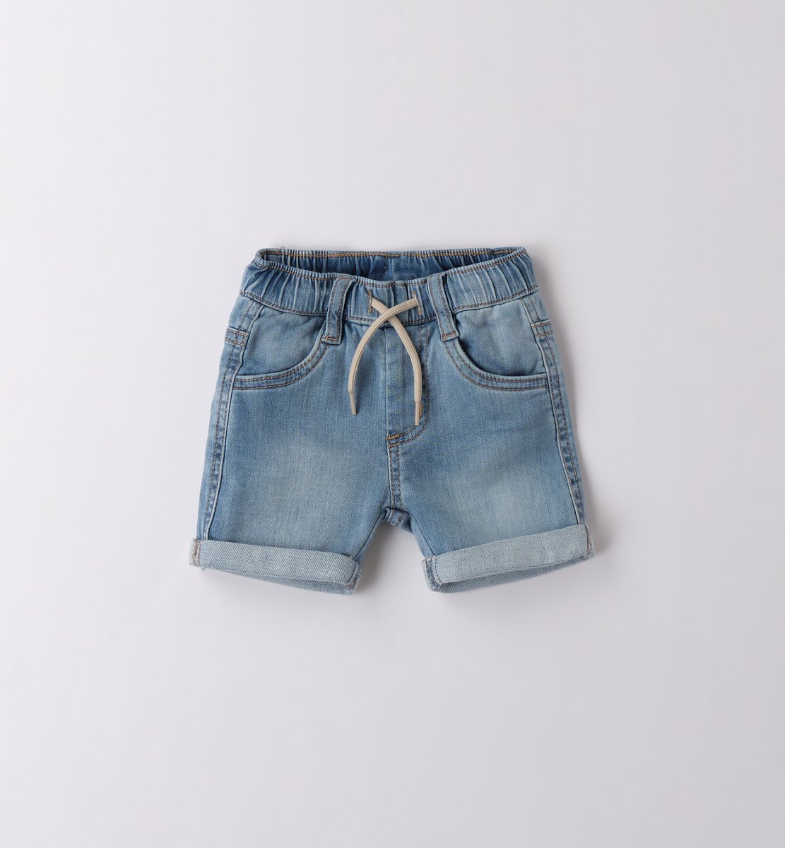 Bermuda di jeans, con elastico in vita e coulisse, con piega e tasche sul retro