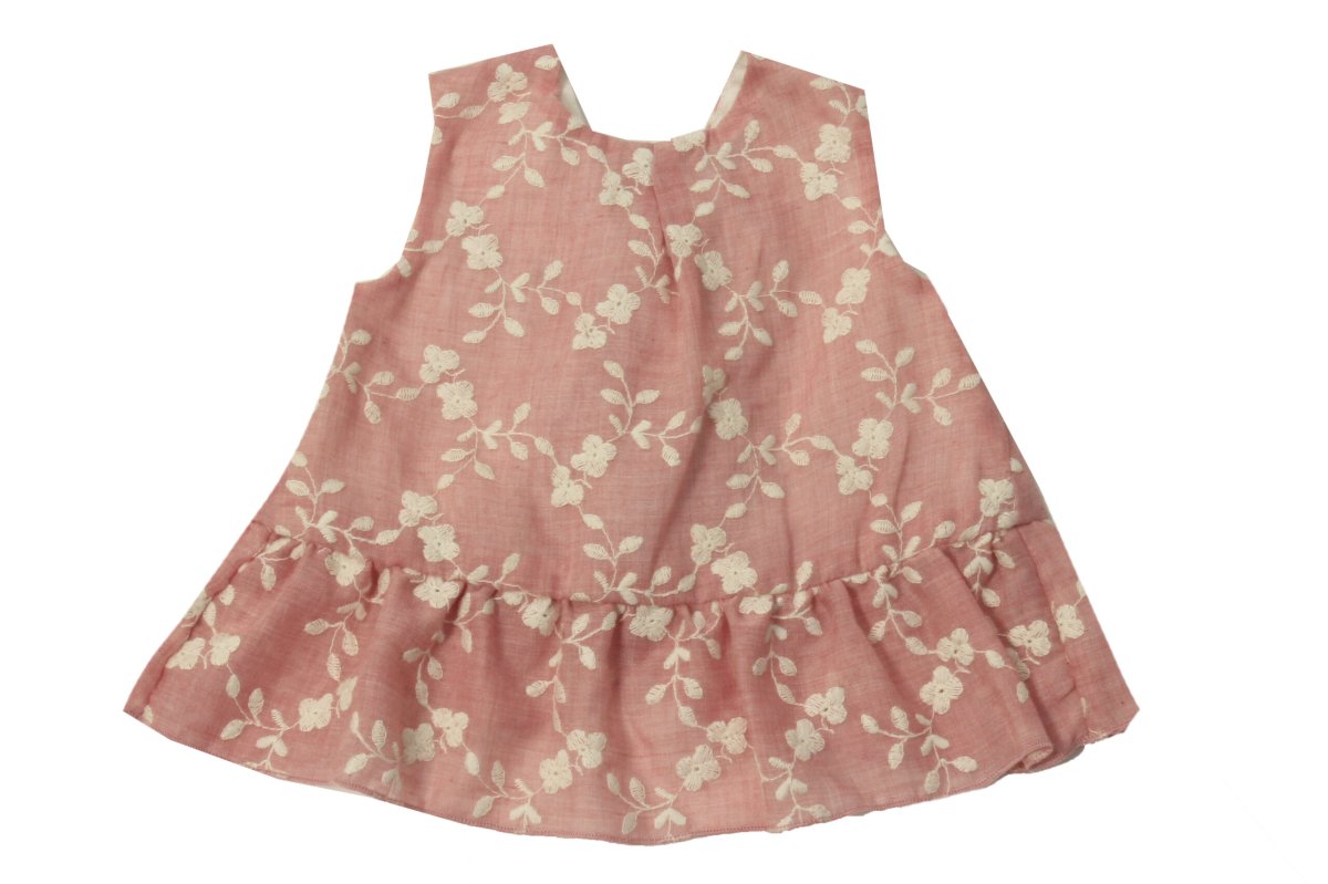 Blusa in cotone e lino a giro colore rosa con ricami panna e fiocco nella parte posteriore