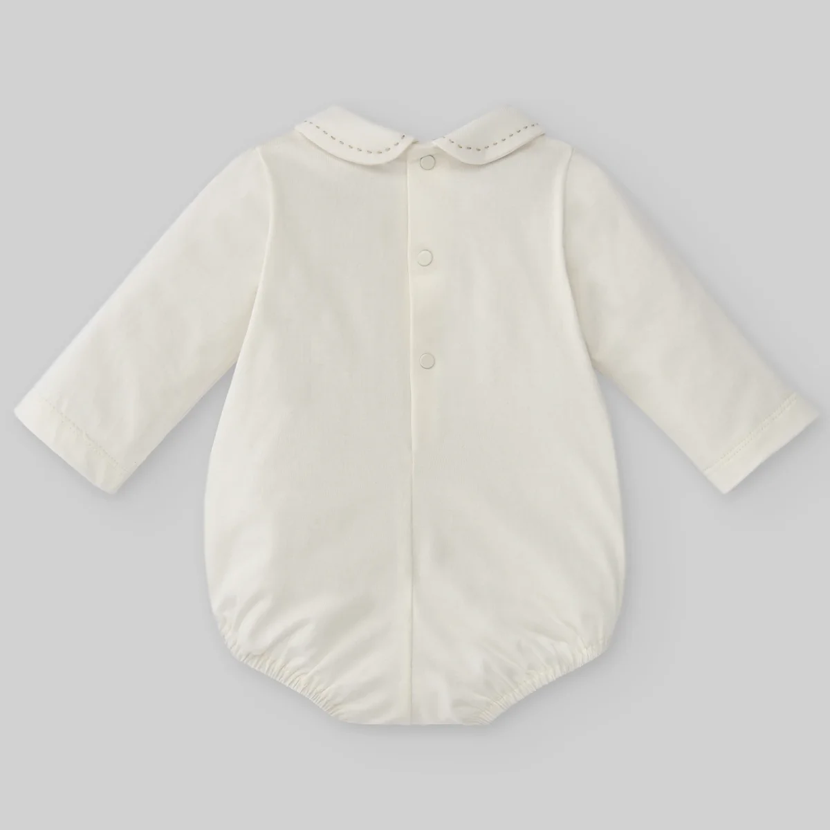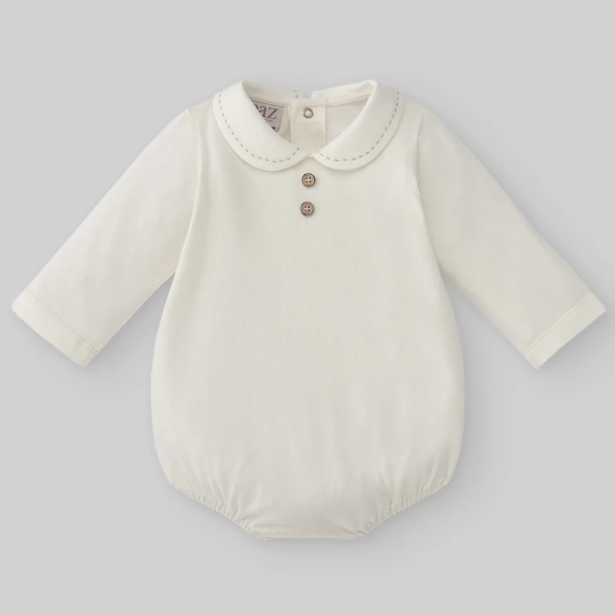 Body in cotone organico colore bianco con chiusura bottoncini nella parte posteriore ed inferiore, dettagli color tortora