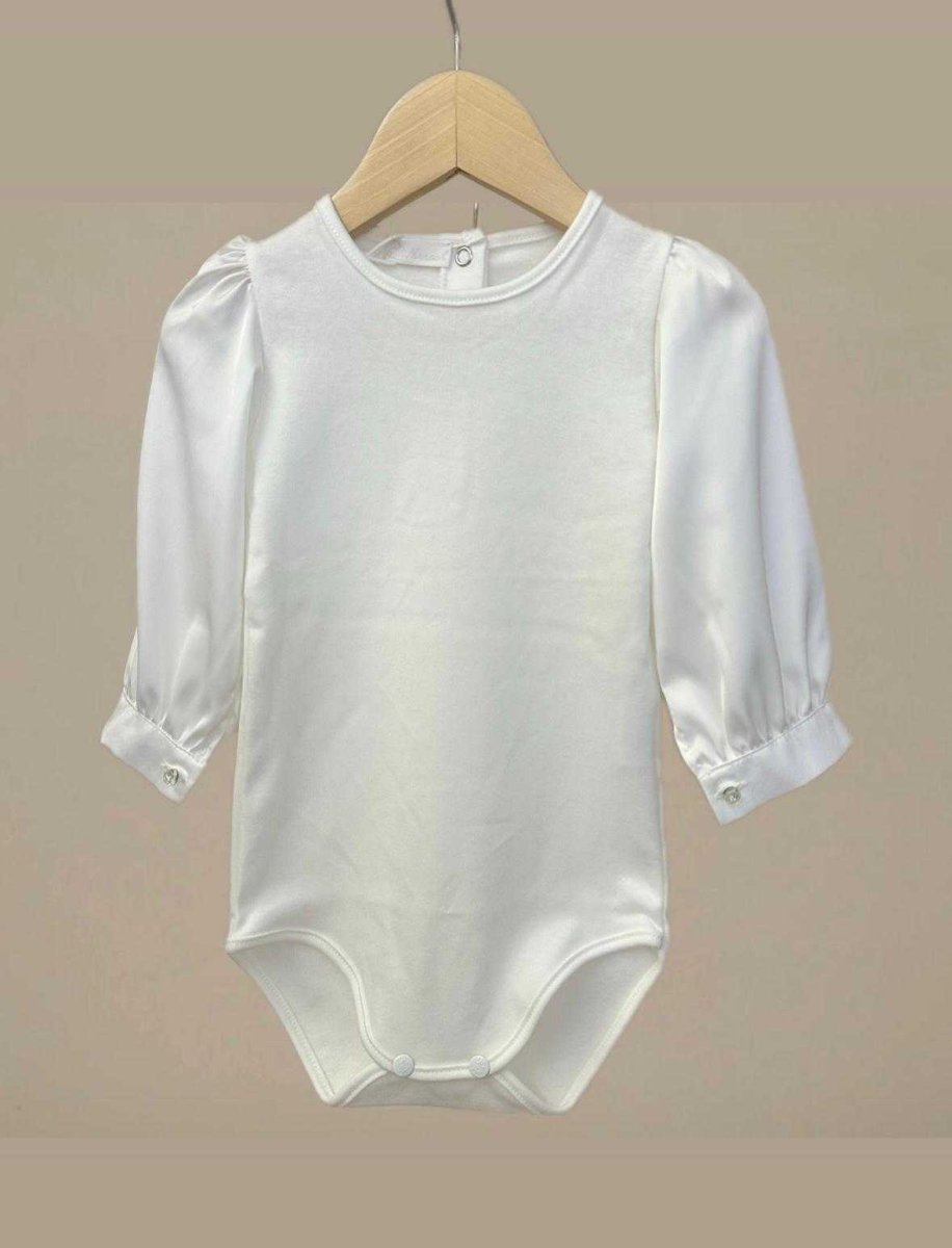 Body in cotone, con manica satin e bottoncino swarovski, con abbottonatura sul retro tramite due bottoncini a clip, colore panna