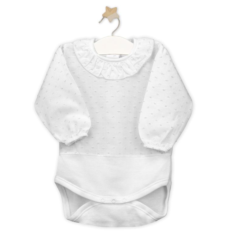 Body a manica lunga colore panna, in plumetis, colletto con rouge, 100% cotone
