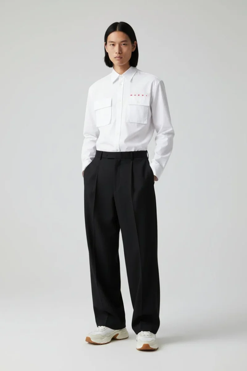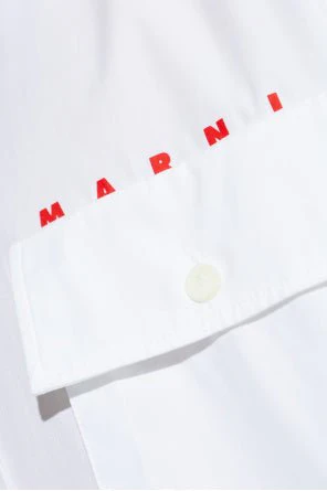 Due ampie tasche simmetriche con patta all’altezza del petto sottolineano il carattere funzionale del modello, mentre la scritta rossa minimalista “MARNI” sopra la tasca sinistra funge da discreto ma riconoscibile segno di prestigio. Questo modello รจ la quintessenza di uno stile senza tempo, una scelta ideale per occasioni speciali e incontri di lavoro.