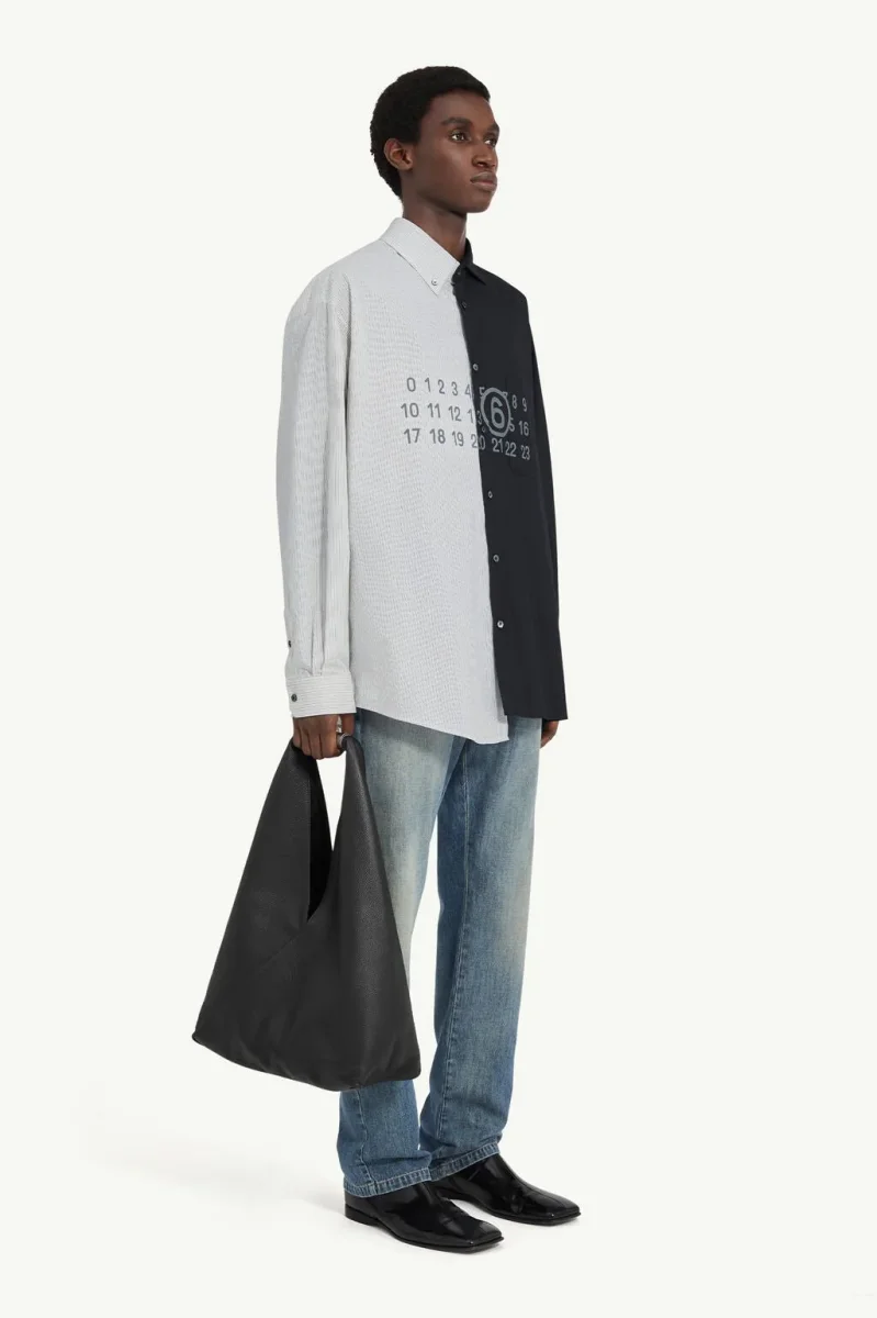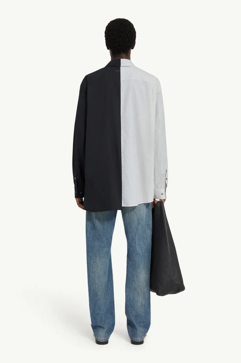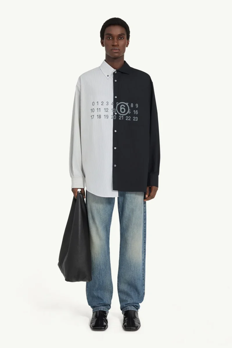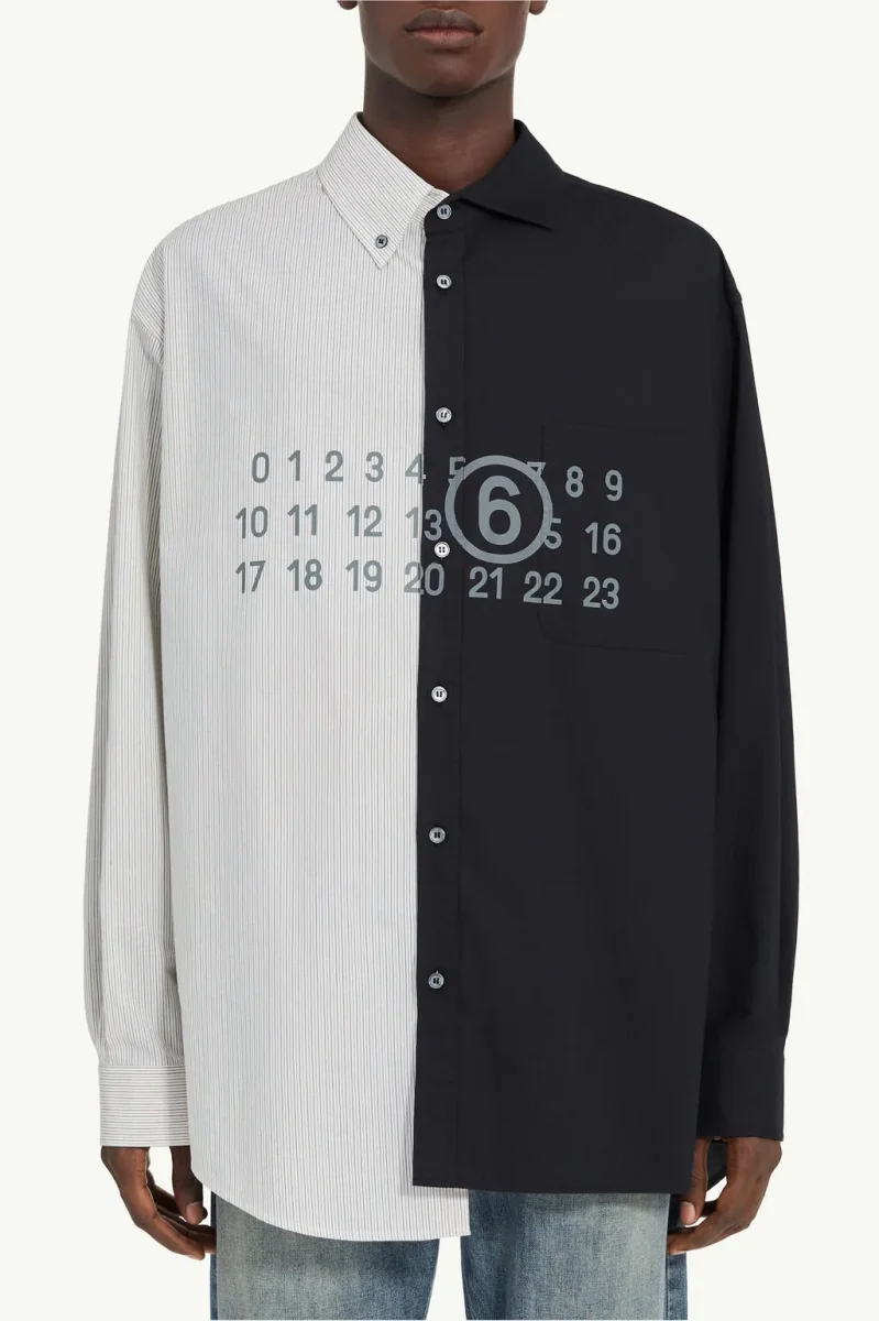 Tagliata in popeline di cotone, questa camicia esprime lo spirito sovversivo di MM6 con una costruzione a metร : un lato a righe e l’altro a tinta unita. La grafica numerica oversize si estende su entrambi i pannelli, volutamente contrastata da un taschino sul petto. Rifinito sul retro con la linea di impunture bianche MM6, questo capo afferma l’identitร della Maison.
