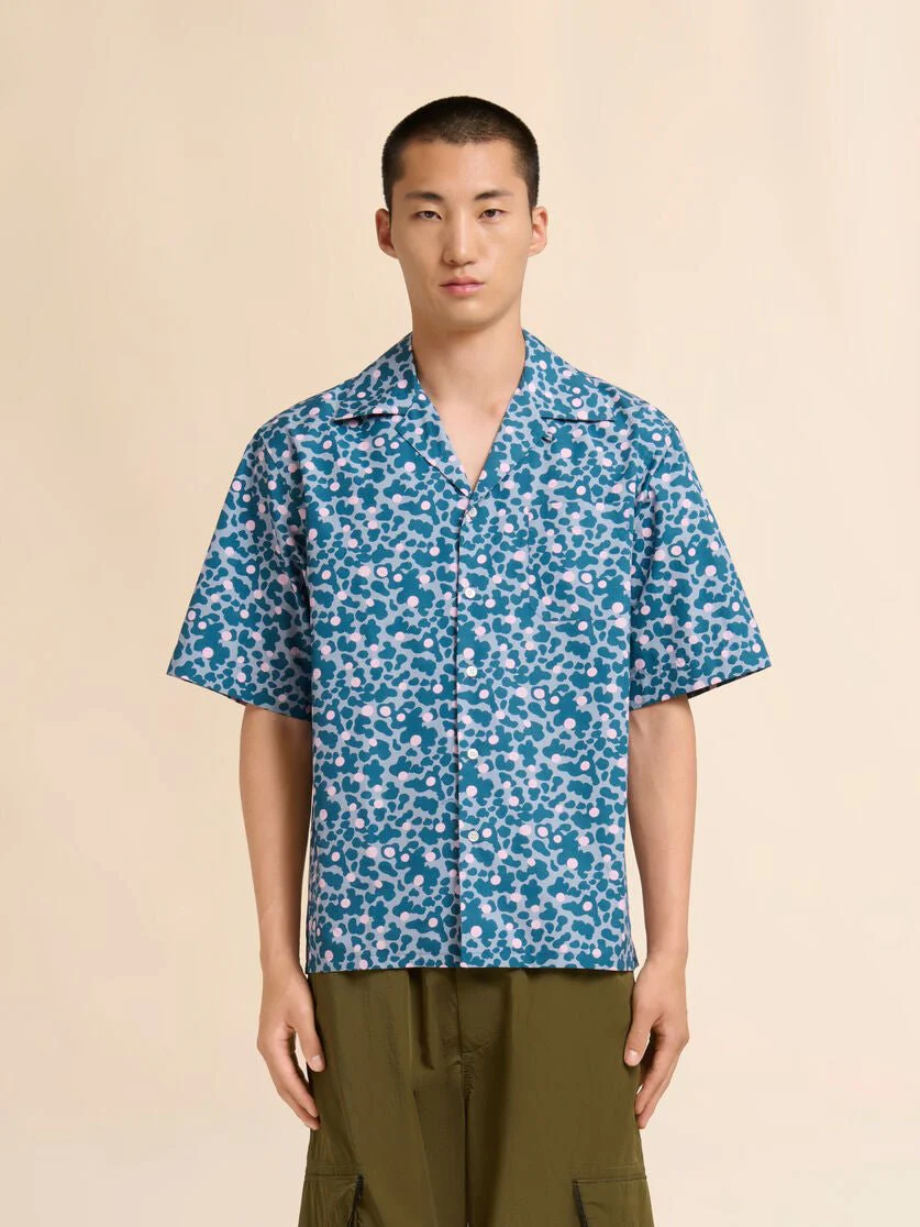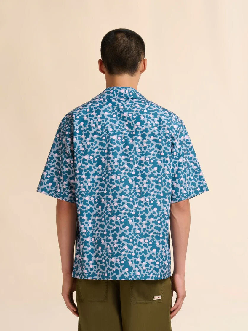Camicia bowling in popeline blu con stampa rosa a pois