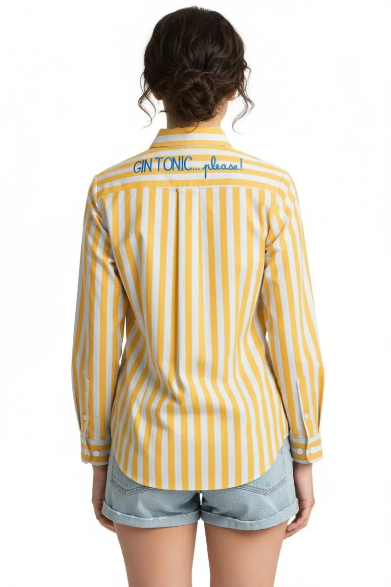 La nostra camicia Brigitte dal taglio rilassato presenta una lunghezza maggiore rispetto alla vestibilitร classica, offrendo piรน spazio su petto e vita. Perfetta per l’estate, puรฒ essere indossata da sola come copricostume o mini-abito, oppure abbinata a shorts, jeans, pantaloni o mini-gonne. La lunghezza varia di 1 cm per taglia e la lunghezza delle maniche varia di 1,5 cm per taglia Colletto a punta con chiusura a bottoni Apertura con bottoni in madreperla Maniche lunghe con polsini abbottonati Spalle scese Carrรฉ posteriore con pieghe sulla pattina Stampa a righe gialle all-over Ricamo Saint Barth “GinTonic…Please!” sul retro Ricamo esclusivo Saint Barth sulla manica Composizione: 100% cotone popeline.